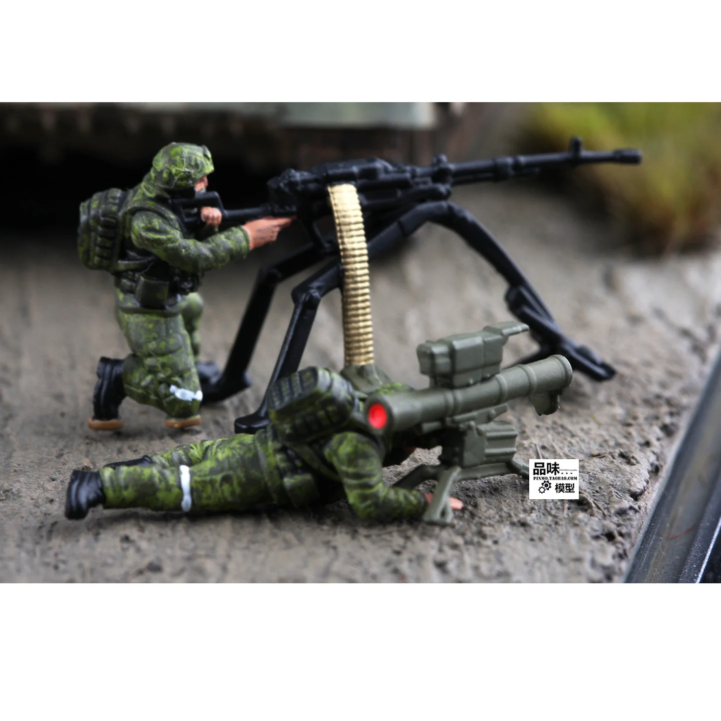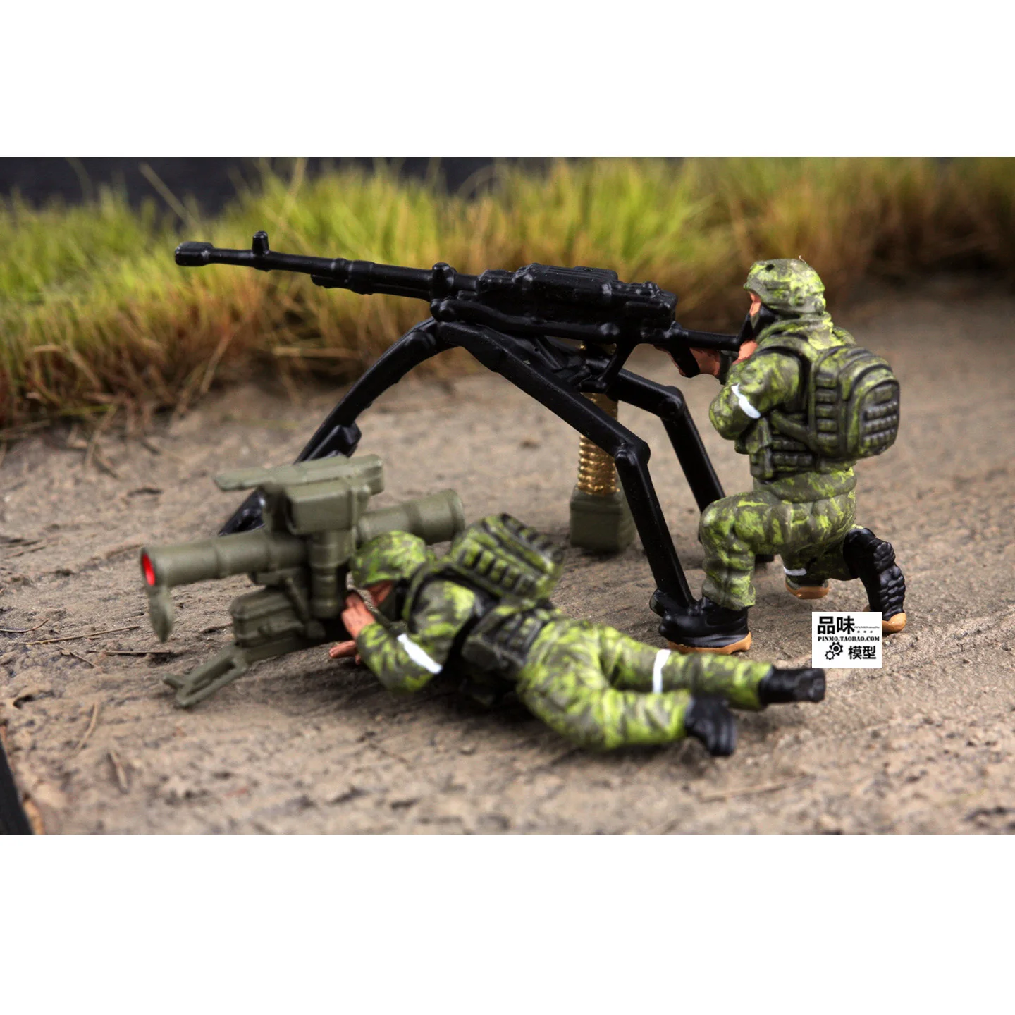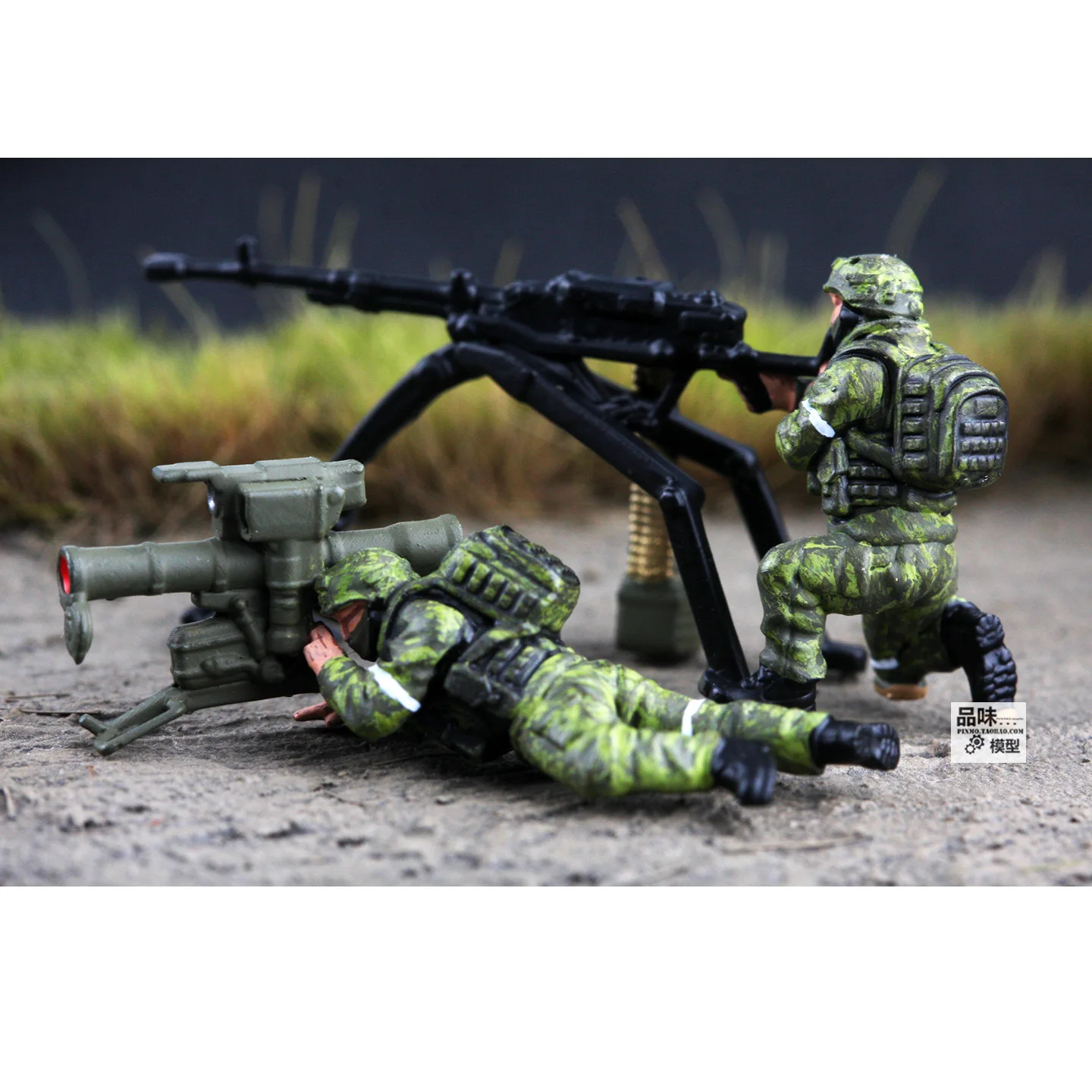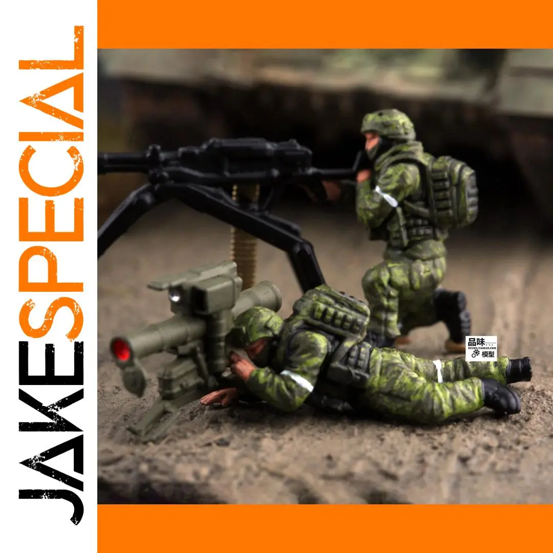 - Two-member scene with posed figures: one aiming prone and another overseeing, capturing tactical military action vividly.