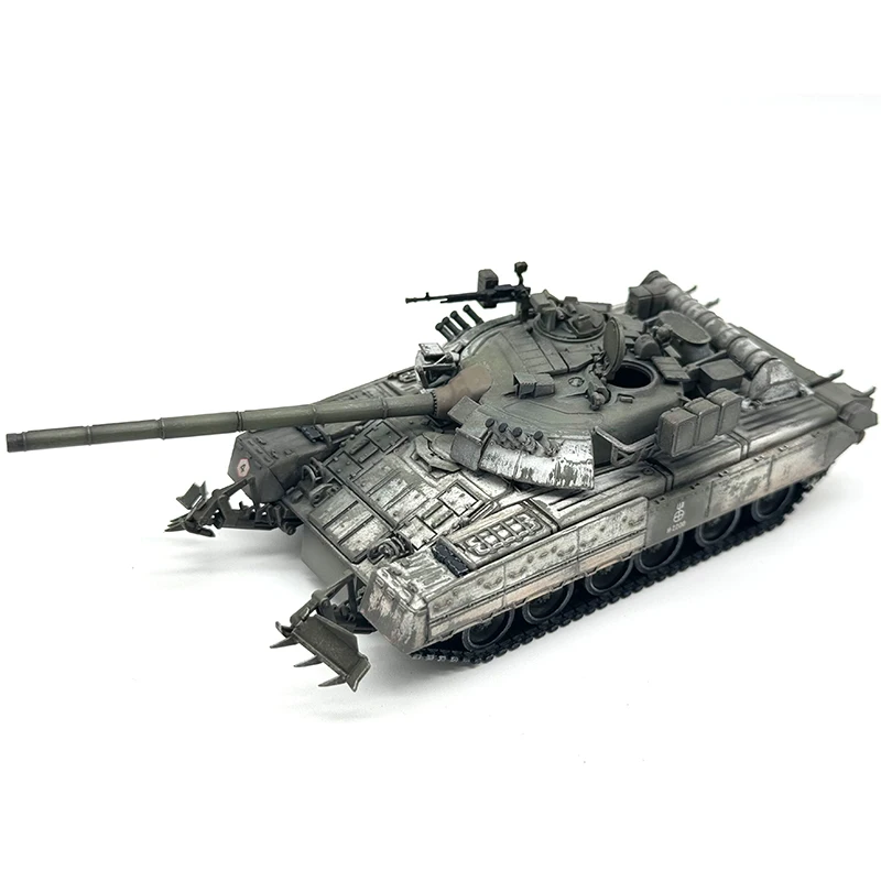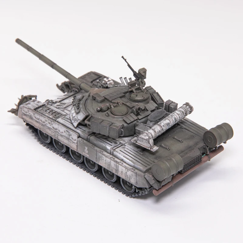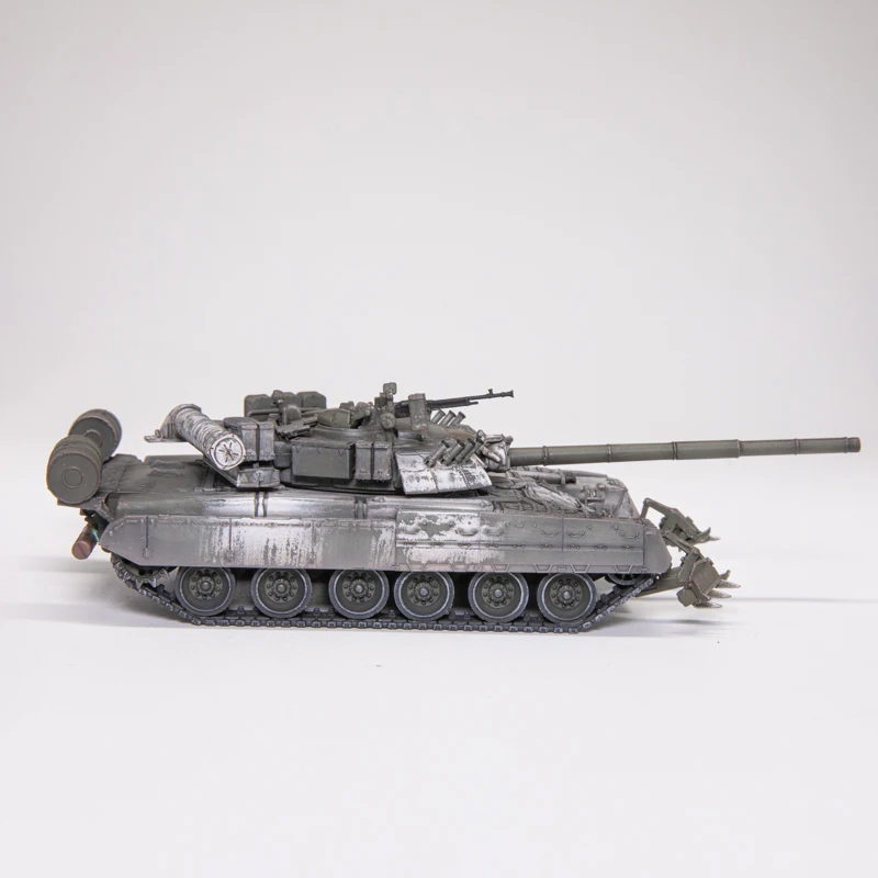 Step into the world of military craftsmanship with this highly detailed 1:72 scale model of the Russian T80U main battle tank. Crafted from durable PVC plastic, this static display piece showcases a weathered metallic gray finish, accentuated with lighter highlights and darker shading to highlight intricate panel lines, armored textures, and battle-worn details. The turret features tiny, textured components such as machine guns and sensors, adding to its realism. The long, slender main gun barrel appears sleek and authentic, while the side skirts and tracked wheels display subtle weathering effects that enhance the rugged, used tank appearance. This model is perfect for enthusiasts seeking a realistic and meticulously crafted collectible piece to decorate their space or showcase their passion for military history.