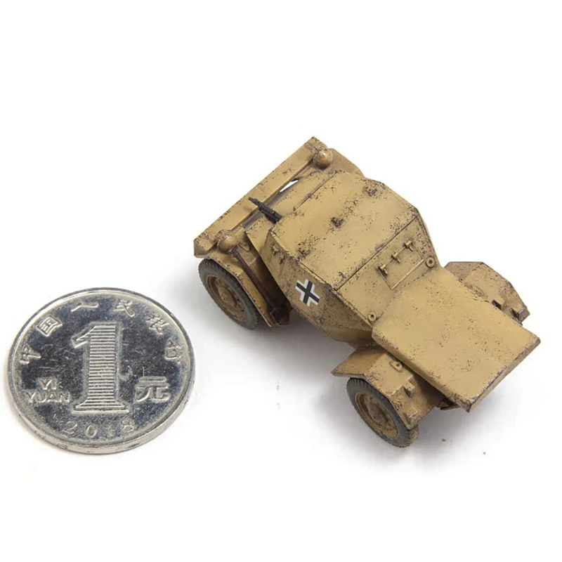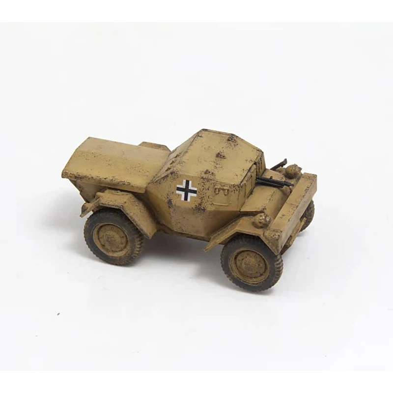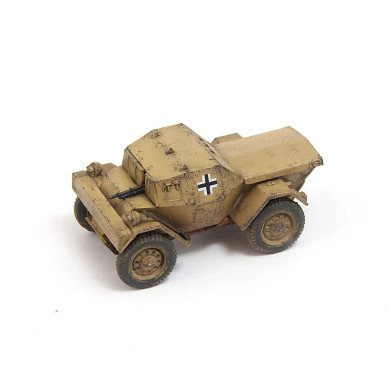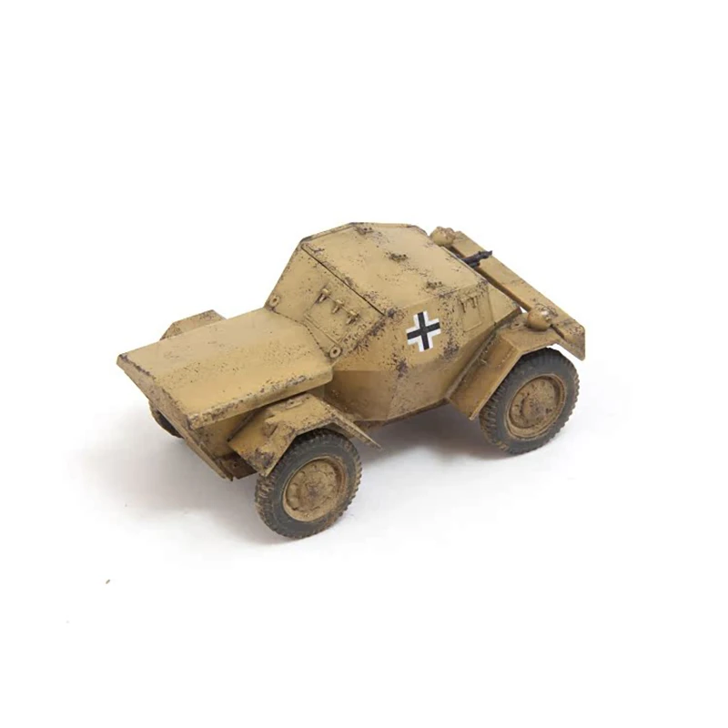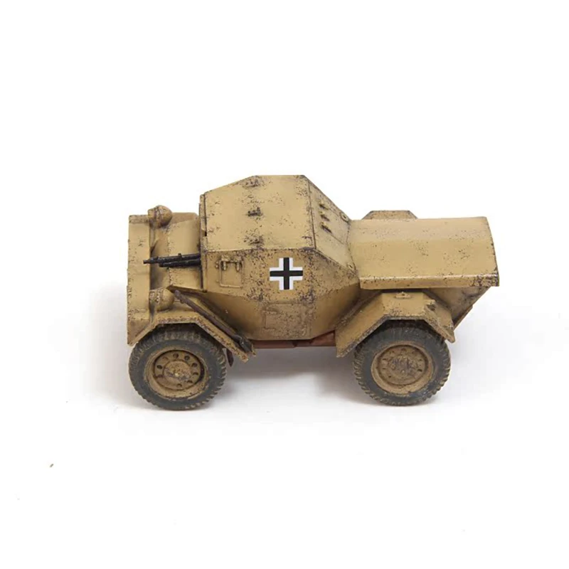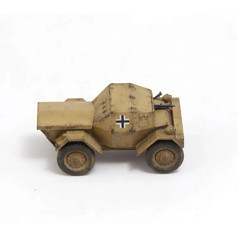 Experience the realism and durability of this meticulously crafted 1:72 scale plastic Dingo wheeled armored reconnaissance vehicle model. Perfect for collectors and military enthusiasts, this model showcases an authentic weathered appearance with a beige or tan finish, complemented by simulated dirt and mud streaks. Its compact, angular design features a sloped front and boxy armor, evoking practicality and ruggedness. The four tires are intricately detailed, with tread patterns and muddy sidewalls, bringing a gritty, operational look to your display. The prominent black and white insignia on each side adds a bold contrast, emphasizing its military heritage. This finely detailed miniature is ideal for showcasing your collection or as an impressive display piece, capturing the essence of real military reconnaissance vehicles.