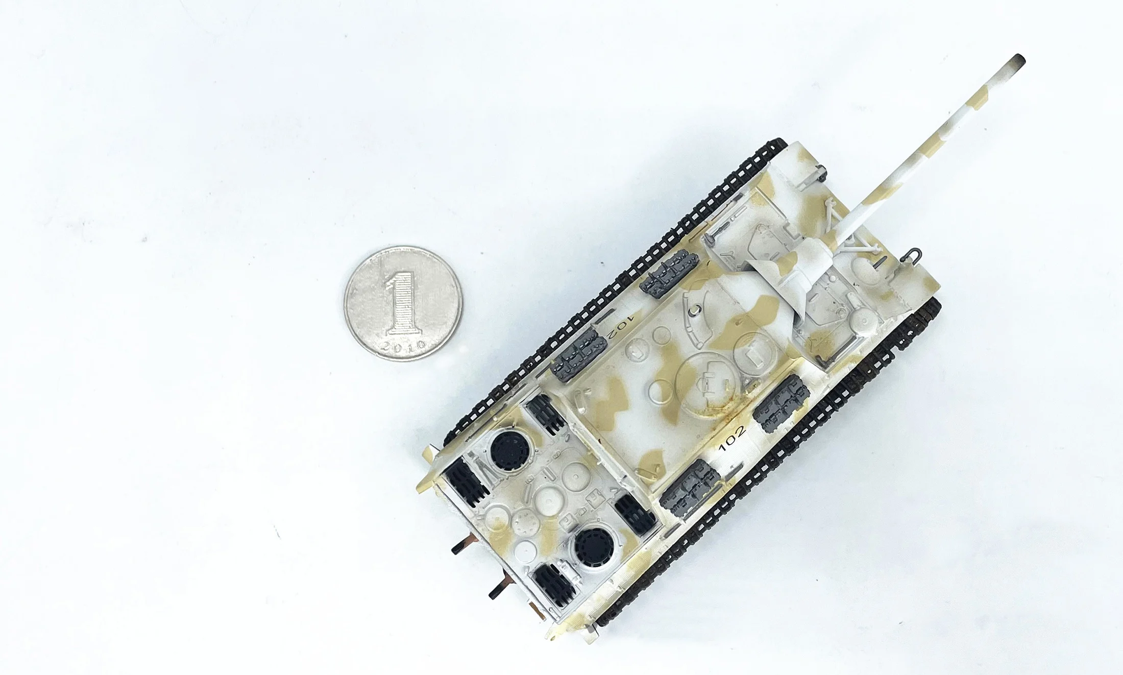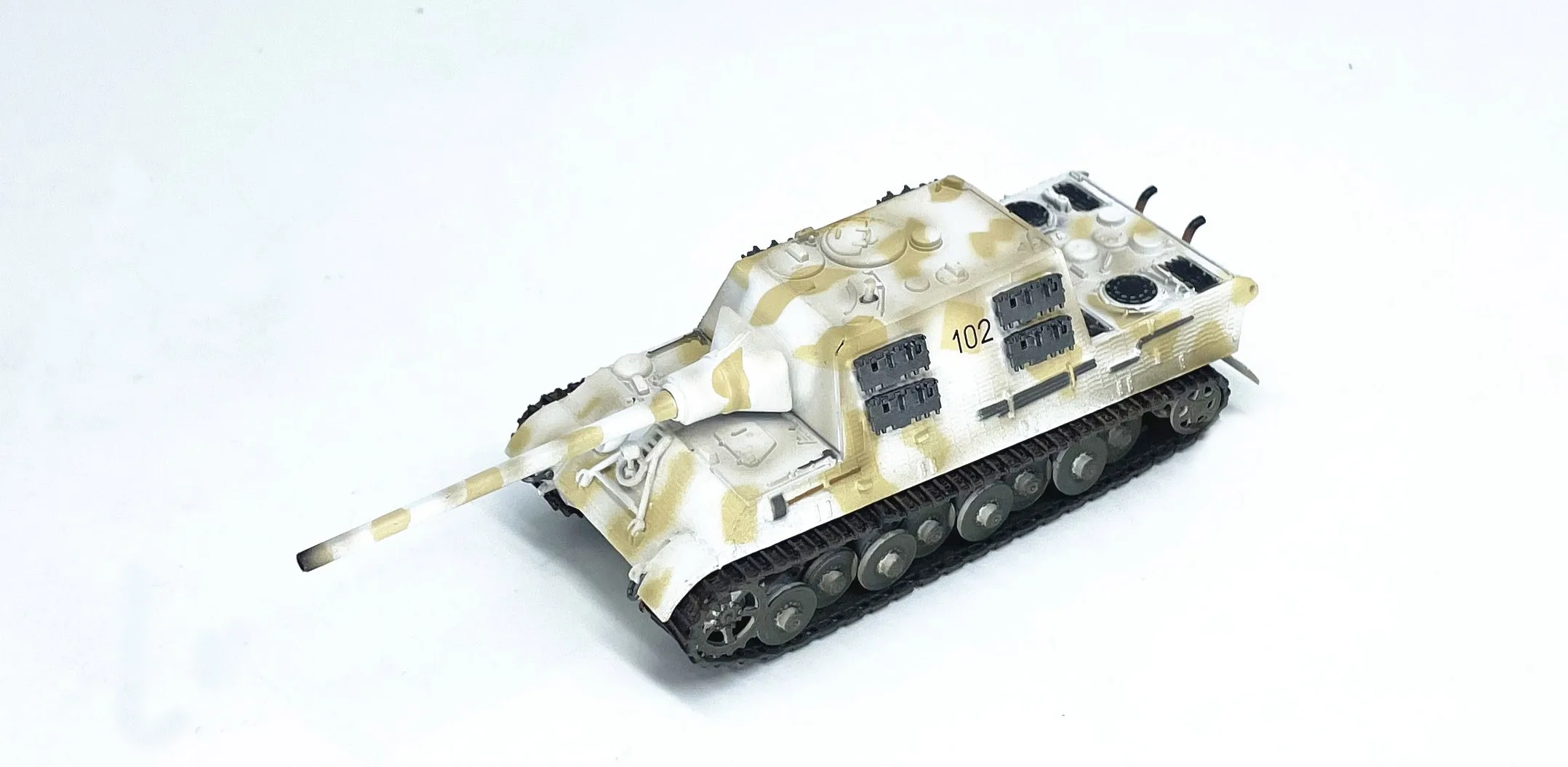 The 1:72 scale German Jagdtiger Tank Model (Model Number: 36115) is a stunning piece that perfectly captures the essence of winter warfare. Crafted from high-quality ABS plastic, this meticulously detailed model measures approximately 125mm in length, 46mm in width, and 44mm in height. It features an eye-catching snow camouflage finish with shades of white and beige, along with a prominent black “102” on the turret, making it a remarkable addition to any collection. Ideal for enthusiasts who appreciate fine craftsmanship, this model is designed for static display, allowing you to admire its intricate design without the distraction of moving parts.