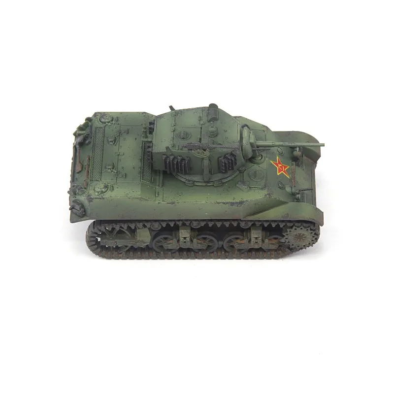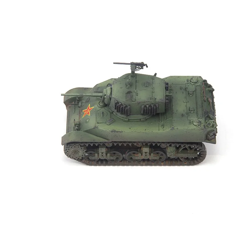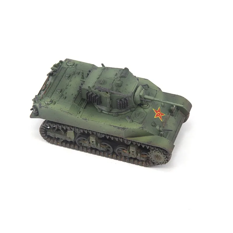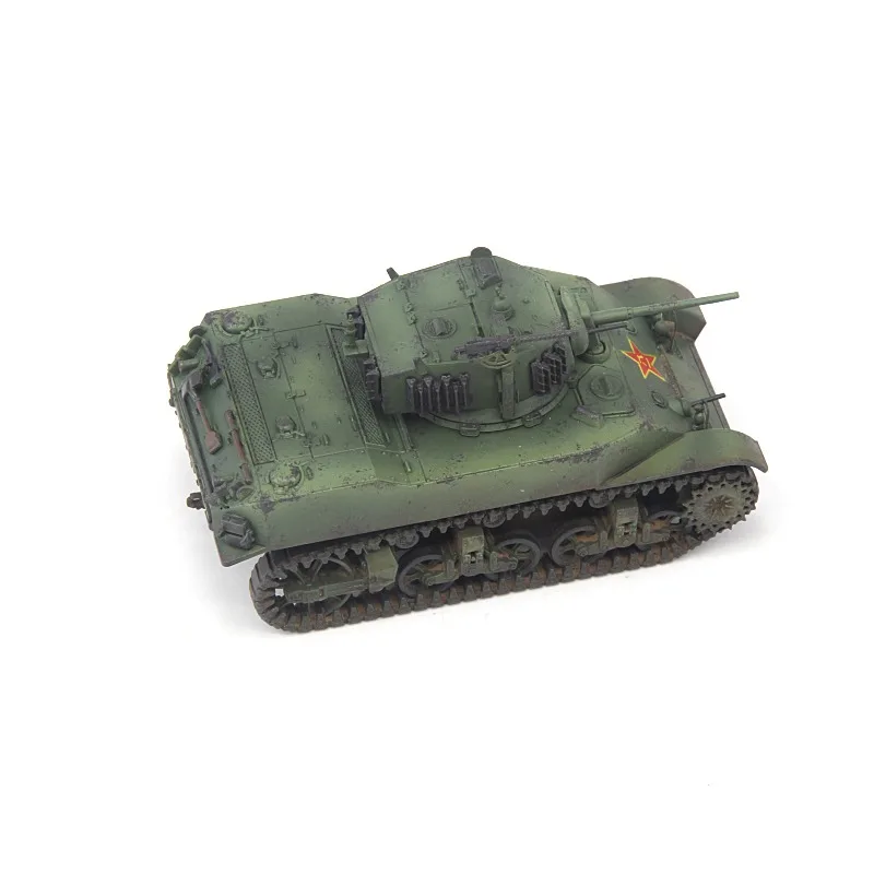 - The tank has a compact, boxy hull with precise panel lines, rivets, and surface detailing that replicate the actual M5A1 Light Tank’s rugged construction.
