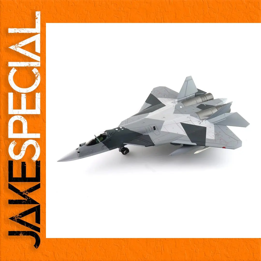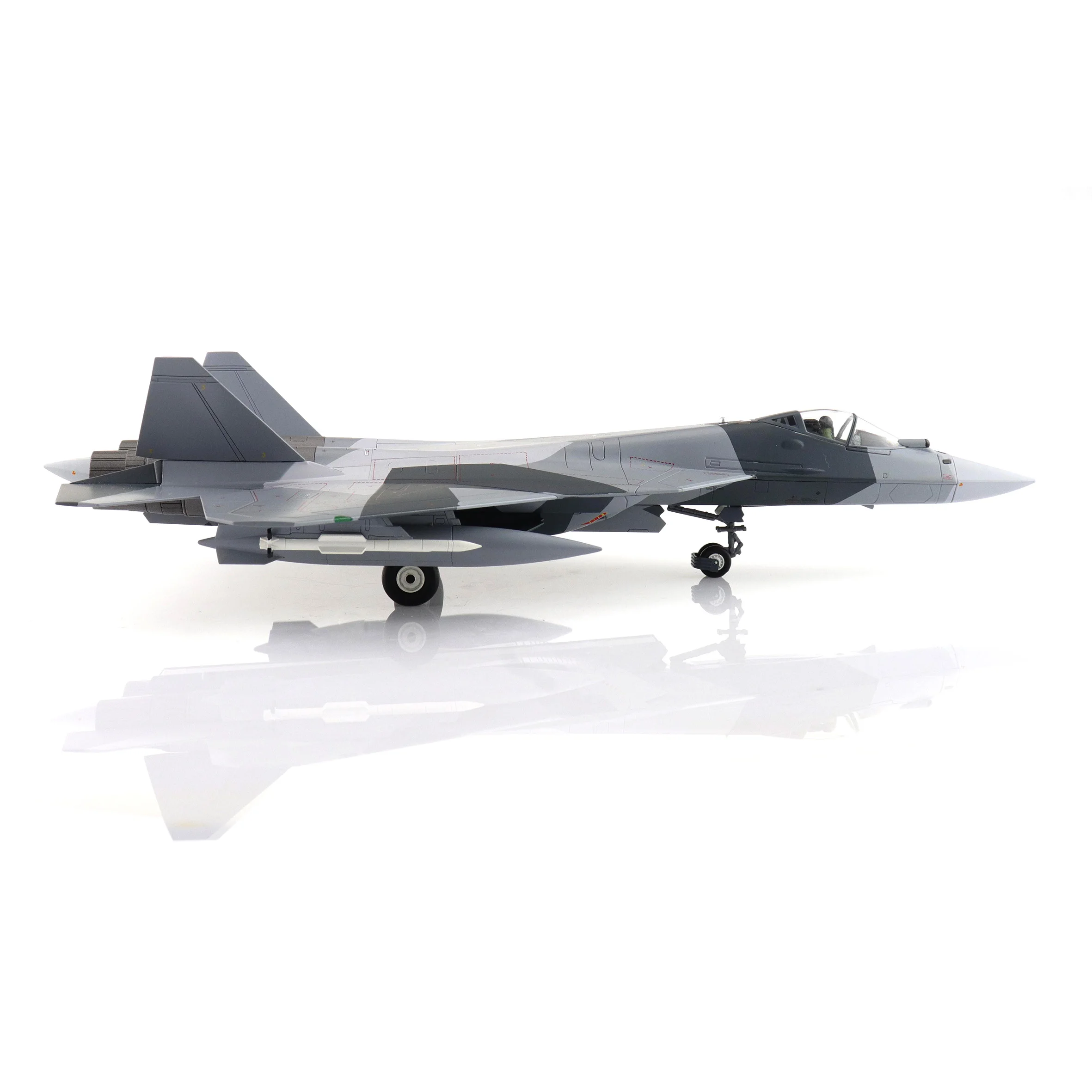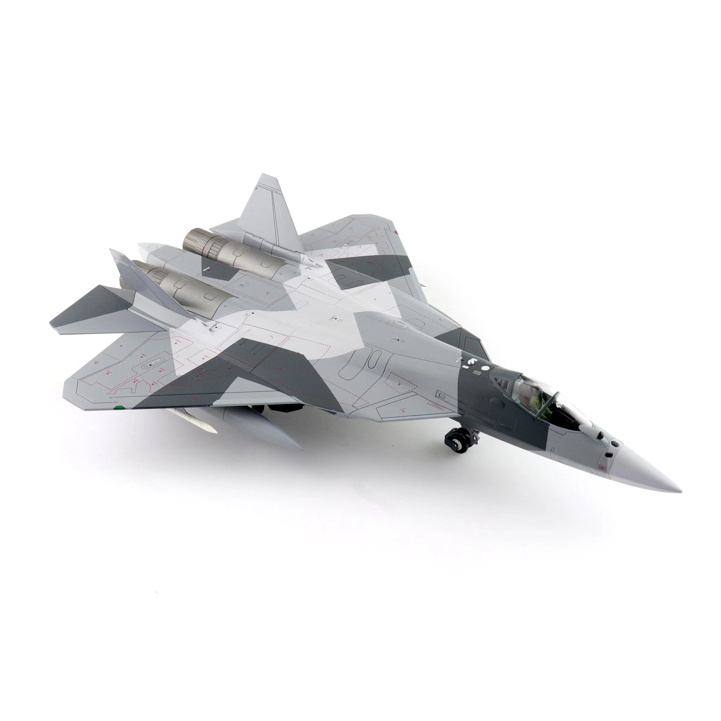 Experience the allure of aviation with the 1:72 scale model of the Russian Su-57 fighter jet (model number HA6807). This detailed model features a captivating split camouflage design in various shades of gray, crafted from durable metal with plastic accessories. With a fuselage length of 27 CM and a wingspan of 19 CM, it exudes precision and craftsmanship. The model showcases a sleek fuselage with a dark-tinted cockpit, sharply angled wings, and intricately designed dual engines with metallic exhaust nozzles. Complete with realistic landing gear and a display bracket, this stunning piece is perfect for collectors and enthusiasts alike.