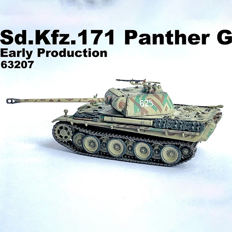 The 1:72 Scale Sd.Kfz.174 Panther G Early Production model, identified by model number 63207, is a meticulously crafted simulation piece made from durable PVC plastic. Designed for display and collection, this static model features a detailed camouflage pattern in shades of green and brown over a cream or tan base, complete with intricate rivets, hatch openings, and realistic dimensions. The turret showcases the number ‘625’, and a finely designed machine gun enhances its authenticity. Finished with detailed tracks and wheel assemblies, this fragile model is perfect for enthusiasts seeking a stunning decorative piece.