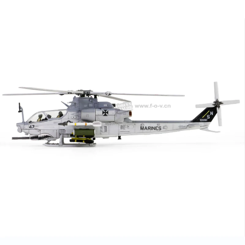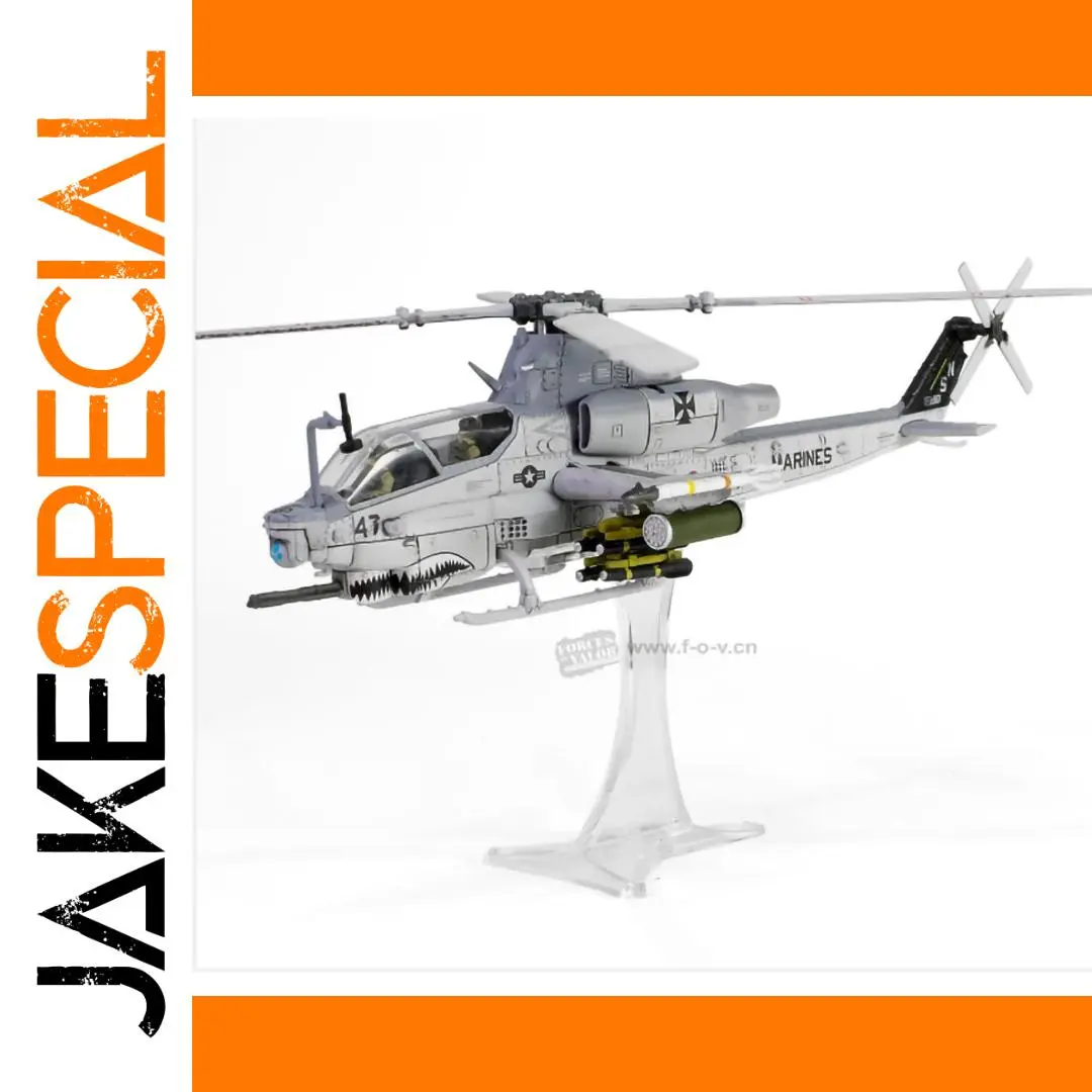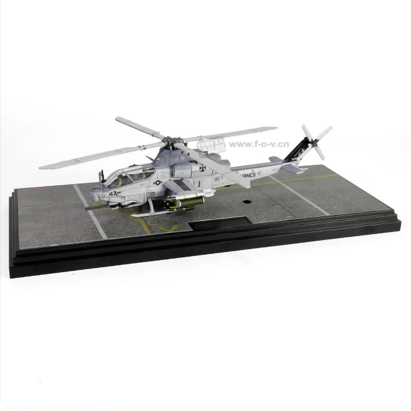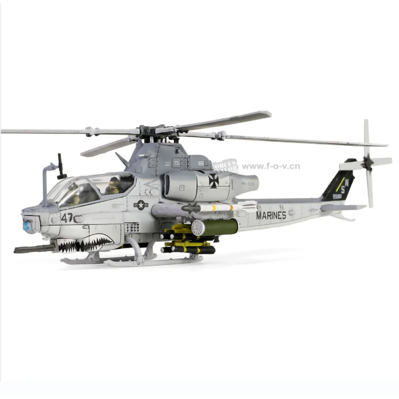 Enhance your collection with this highly detailed 1:72 scale diecast replica of the US Bell AH-1Z Viper military fighter aircraft. Made from alloy and ABS plastic, this realistic model features finely molded surface details with panel lines, rivets, and antennae, all finished in a sleek light grey color. The cockpit boasts a transparent canopy revealing an intricately detailed interior, while the nose displays an eye-catching shark mouth design with sharp teeth and a blue nose light. Equipped with authentic weaponry and insignia, this model captures the essence of the Viper helicopter’s design. Mounted on a clear stand, it offers a dynamic display of a true-to-life military aircraft suitable for collectors and enthusiasts.