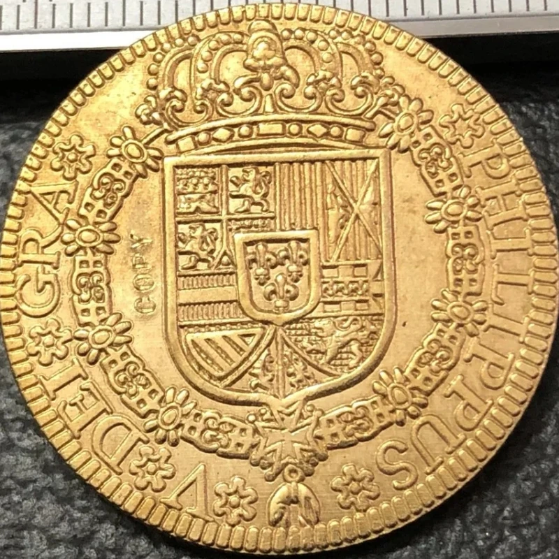 - This coin is a carefully cast imitation of the 1725 Spain 4 Escudos-Felipe V Cuenca, with an antique European style and a shiny, gold-colored finish that enhances its vintage appeal.