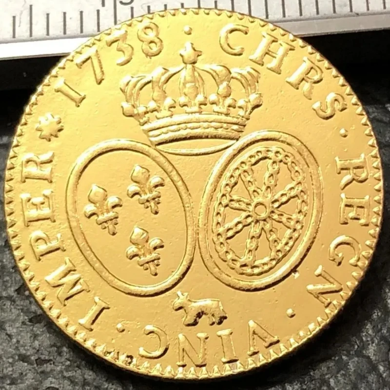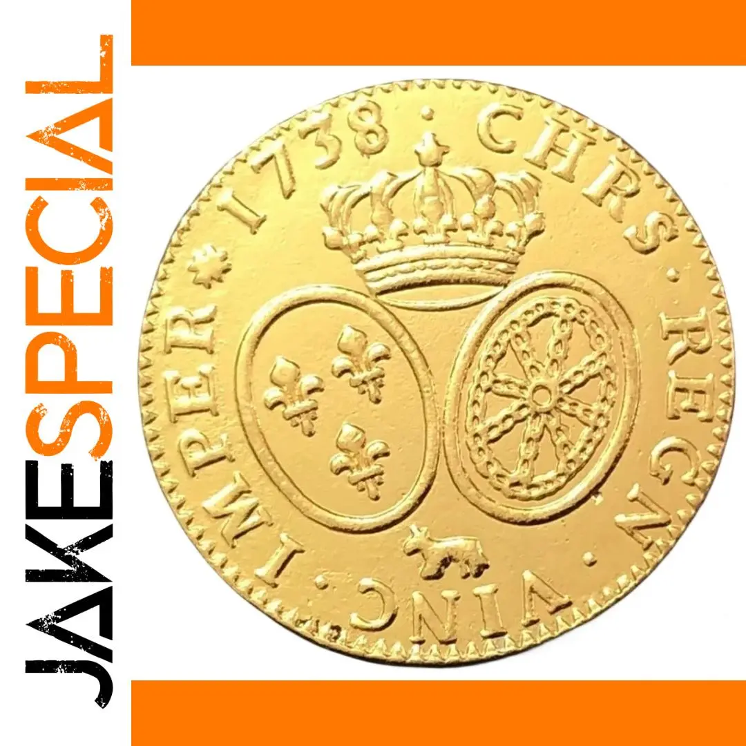 Own a stunning replica of the 1738 France 1 Louis d’Or with this intricately designed metal coin, crafted using traditional casting techniques. Featuring an antique European style, the coin showcases a detailed crest with a crowned top, two side-by-side shields—one adorned with three fleur-de-lis and the other with a wheel motif—a small animal figure beneath the shields, and a border of raised dots encircling the design. The surface has a shiny, warm golden hue that emulates real gold, while the inscription “1738” and other historical motifs emphasize its regal heritage. This collectible piece offers a rich, historical aesthetic perfect for enthusiasts and collectors.
