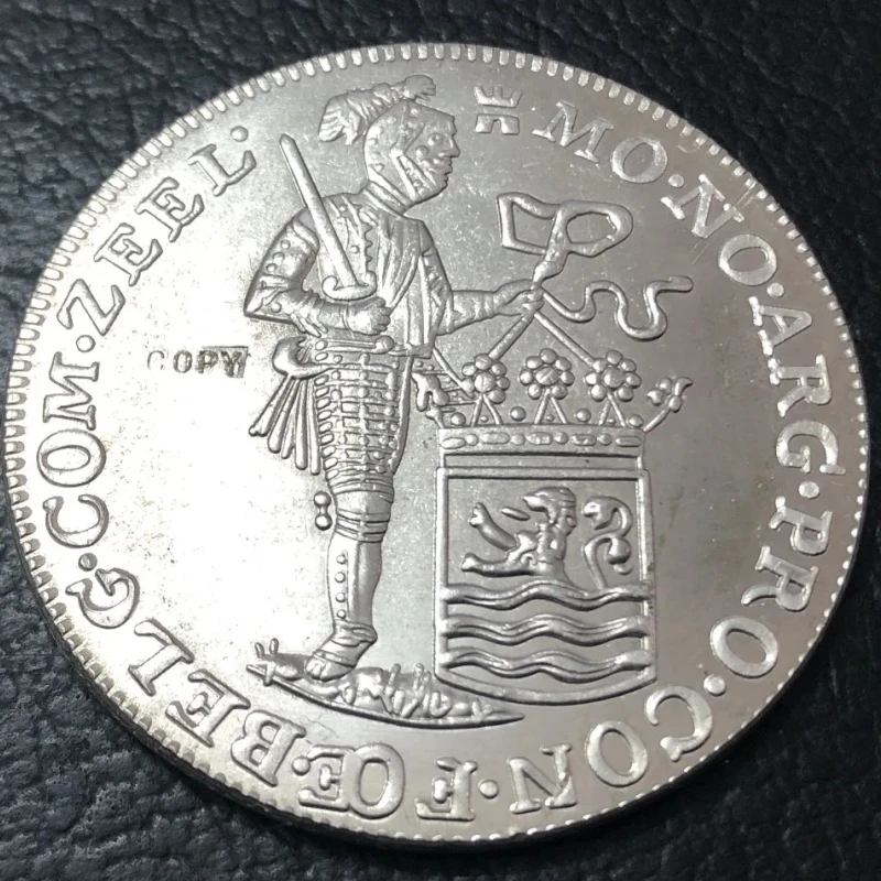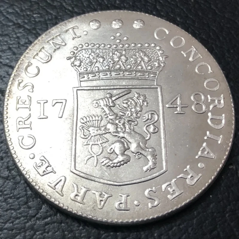 Experience the timeless charm of this meticulously crafted replica coin, inspired by the historic 1748 Dutch Republic Silver Ducat. With its antique European style and aged silver finish, it captures the essence of the original coin’s regal design. The detailed relief features a majestic heraldic lion crowned and standing proudly, holding a sword and the pike, symbolizing strength and nobility. Encircled by inscriptions such as “CONCORDIA” and “PEARL,” and flanked by the years “17” and “48,” the coin exudes a vintage allure. The textured, dotted edge further enhances its ornate appearance. Perfect for collectors, it embodies historical grandeur while offering a beautiful decorative piece that evokes a sense of heritage and elegance.