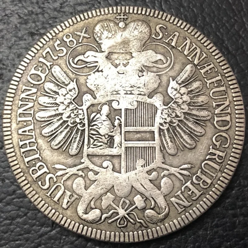 Experience the timeless charm of European history with this beautifully crafted replica of the 1758 Austria-Habsburg Maria Theresia Thaler. Designed with intricate details, it features a vintage, antique appearance that evokes the grandeur of 18th-century European craftsmanship. The metallic surface displays a weathered patina, emphasizing its historical allure. The central obverse showcases a richly detailed crowned coat of arms, segmented into multiple sections with fine figures and striped patterns, complemented by two majestic eagles with outstretched wings. An ornate crown adds regal elegance, while engraved inscriptions and a dot-embellished border complete the classical design. This replica combines historical authenticity with artistic craftsmanship, making it a striking collectible or decorative piece for enthusiasts and history lovers alike.