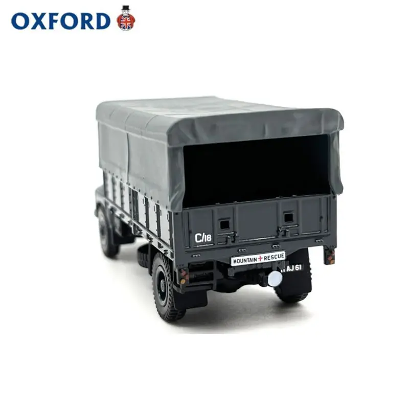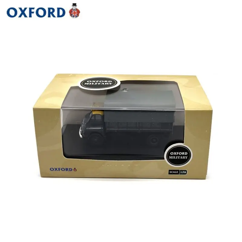 The OXFORD 1:76 Bedford Transporter is a meticulously crafted diecast model car made from alloy and plastic, featuring a dark gray body with a bright yellow roof for a striking contrast. Measuring 8.5 cm in length, 3 cm in width, and 4 cm in height, this model showcases intricate details including round headlights, a prominent black grille, a white bumper, and a decorative label on the hood. The flatbed is covered with a textured gray tarp and detailed with raised paneling and rivets, while the black wheels exhibit a realistic tread pattern. Perfect for collectors, this model captures the nostalgic essence of the classic Bedford Transporter.