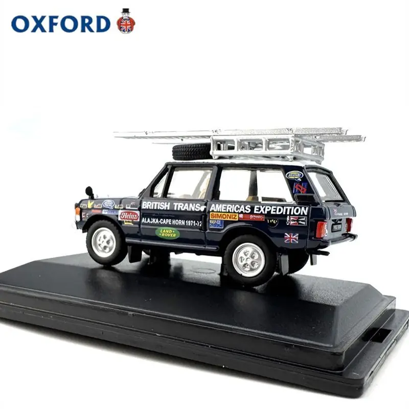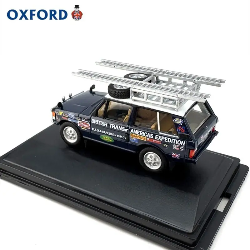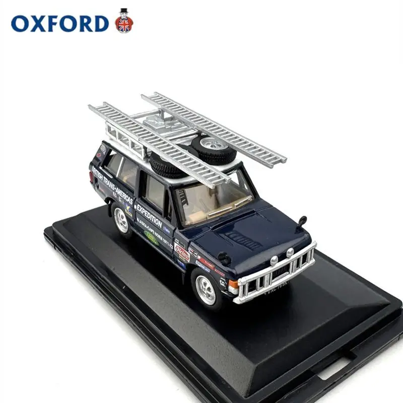 The OXFORD 1:76 Scale Range Rover is a stunning diecast model that embodies the spirit of adventure with its vibrant blue exterior. This collectible features an off-road design, complete with a roof rack and spare tire for that rugged touch. Adorned with decals celebrating British expedition themes, including “BRITISH TRANS-AMERICAS” and “ALASKA-CAPE HORN 1971-72,” it brilliantly captures the essence of exploration. Made primarily of alloy and plastic, this model stands 5.8 cm long, 2.4 cm wide, and 2.8 cm high, making it an ideal addition to any collection. Its detailed wheels and black plastic base elevate it as an eye-catching display piece.