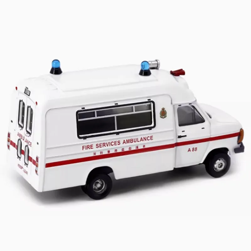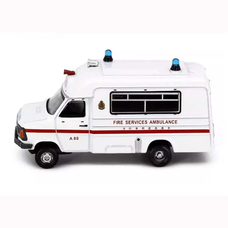 This exquisite diecast model of the Hong Kong Fire Service Ambulance is perfect for collectors. With a striking white exterior accented by a bold red stripe, it captures attention with the prominently displayed “AMBULANCE” sign above the large windshield. The fine details, such as the black-carved tires, chrome hubcaps, and classic emergency lights, highlight its craftsmanship. Designed for adults aged 14 and above, this model is intended for display or gifting, not as a toy for children. Adding this piece to your collection allows you to appreciate the meticulous artistry of alloy and plastic construction and relive the essence of Hong Kong's fire service.