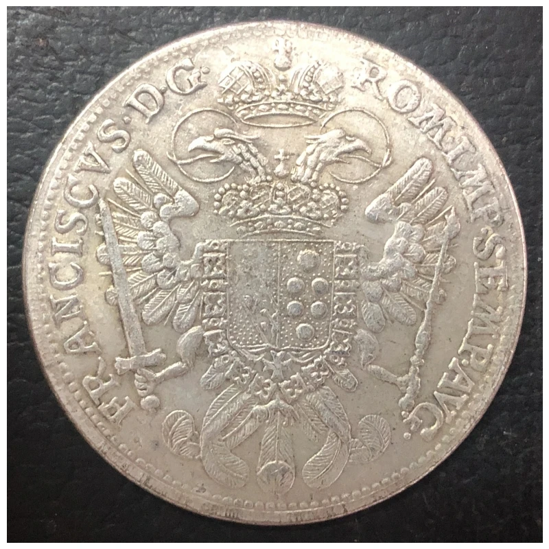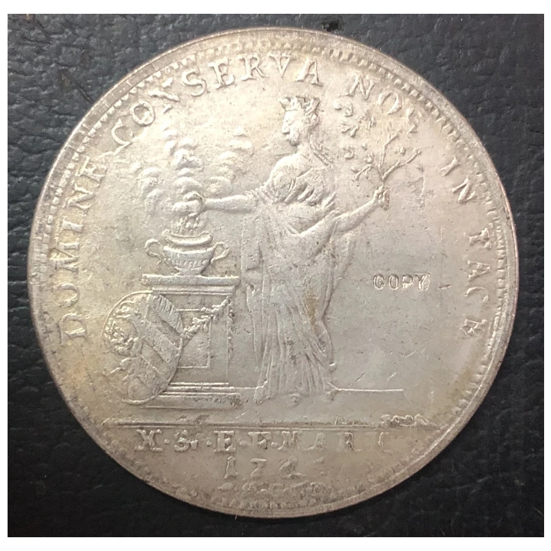 Discover a meticulously crafted replica of a 1765 German States Thaler-Franz, featuring intricate relief work, a circular shape with a raised rim, and an aged, antique finish. This high-quality cast coin showcases a classical female figure holding an olive branch and shield, set against a plain background, with decorative elements such as an urn and ornamental motifs. Dated to 1840 or earlier, it embodies patriotic themes and historical craftsmanship, making it a striking addition for collectors and enthusiasts. Made from durable metal suitable for casting, this reproduction exudes vintage charm, detailed detailing, and an authentic aged appearance, perfect for display or historical appreciation.
