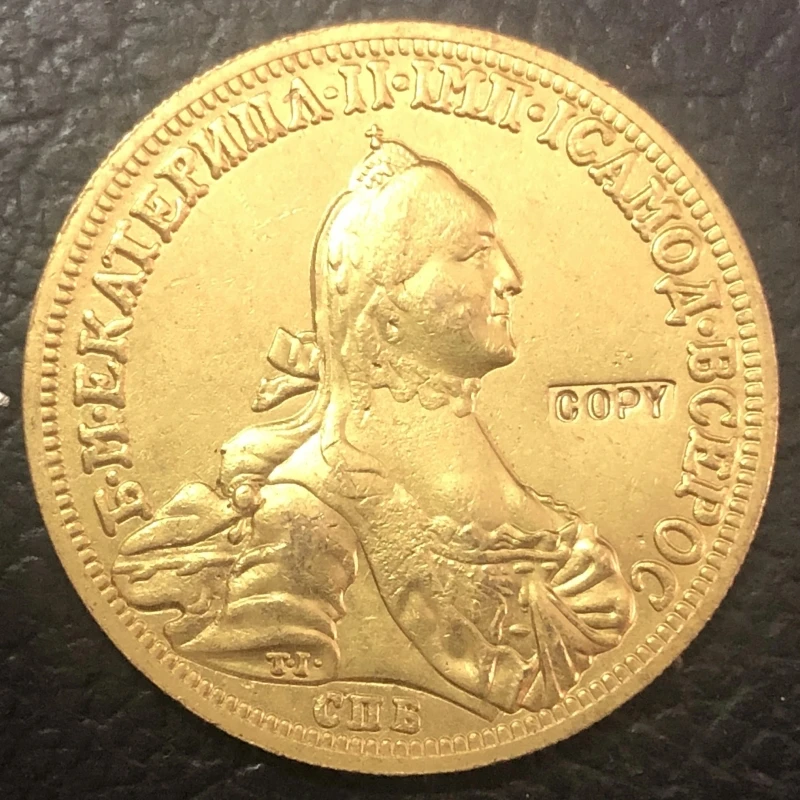 Step into history with this stunning replica of a 1775 Russian coin, beautifully crafted to evoke European antique aesthetics. Made from durable metal, it features a warm 22K gold-like finish that lends a luxurious, vintage appearance. The detailed design showcases a prominent portrait of a woman in profile, dressed in classical attire with her hair styled elegantly back and adorned with a ribbon or band. An ornate dotted border encircles the perimeter, enhancing its decorative appeal. The surface is textured with fine, detailed lines, giving it an authentic aged look, perfect for collectors or patriotic displays. It captures the spirit of 18th-century European craftsmanship in a timeless and elegant style.