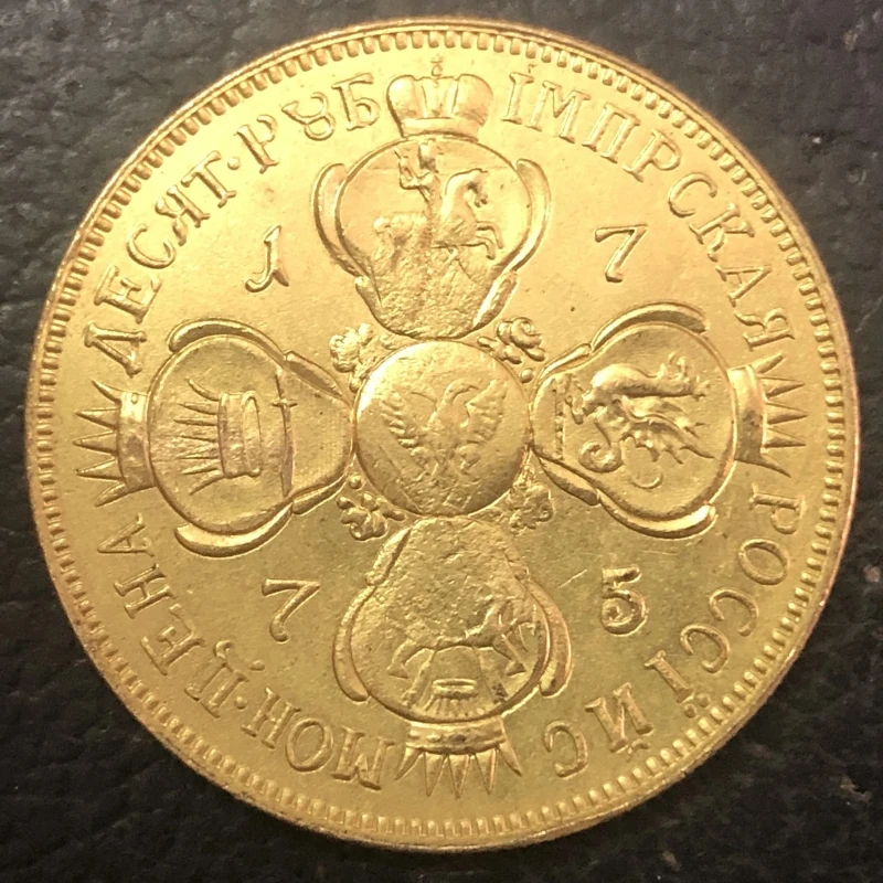- Detailed 1775 Russian coin replica featuring a 22K gold-like finish for an authentic vintage look.