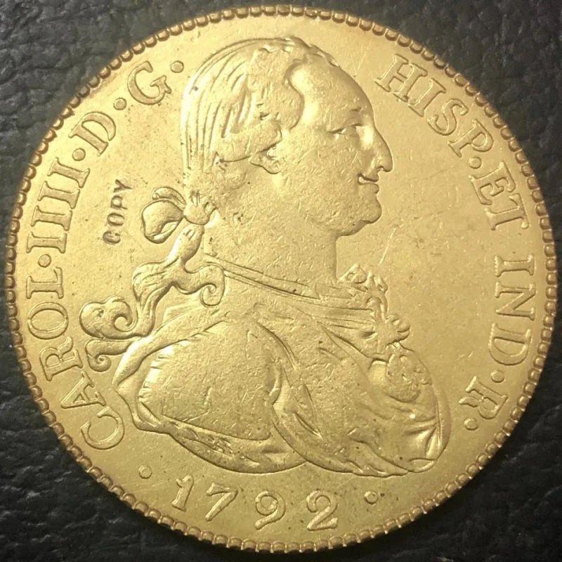 Step into the past with this beautifully crafted gold-colored coin that captures the regal and antique essence of the 1792 8 Escudos from Spain. Its intricate design and vintage finish make it a perfect addition to any collection, evoking a sense of history and craftsmanship. The coin features a detailed central coat of arms, topped with a regal crown, surrounded by an ornate laurel wreath tied with a ribbon. The edge is decorated with a beaded pattern, emphasizing its antique style. Its warm gold-tone finish and finely engraved details provide a sophisticated look, blending historical authenticity with collectible charm. Visualize owning a piece reminiscent of European royal history, beautifully reproduced for display or collection.