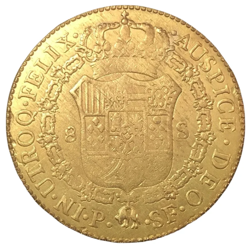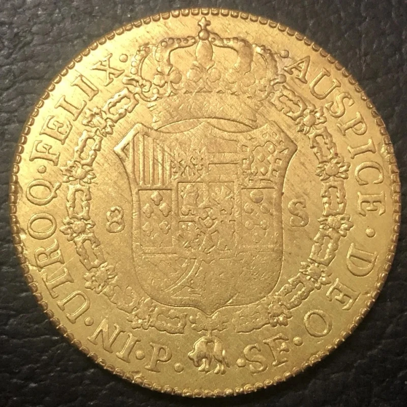 - Crafted with a vintage, antique-inspired design replicating the 1792 Spanish 8 Escudos coin with detailed heraldic motifs and historic symbolism.