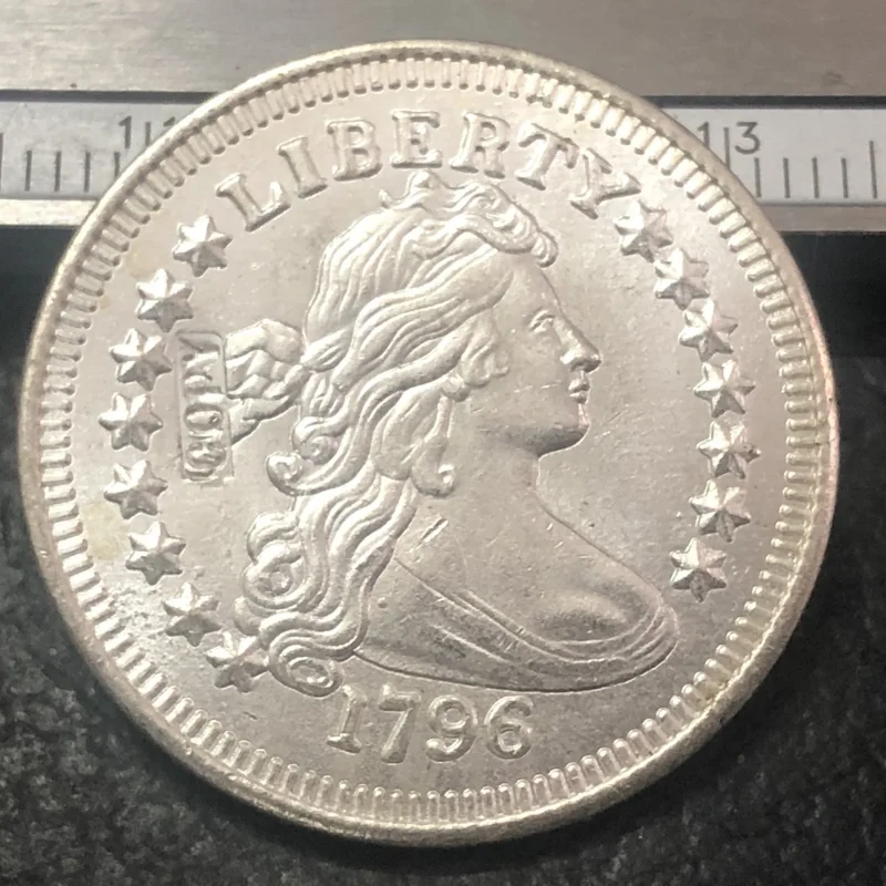 - This coin is a cast imitation made of durable metal with a silver-toned antique finish, designed to replicate the historic 1796 United States quarter from early American minting.