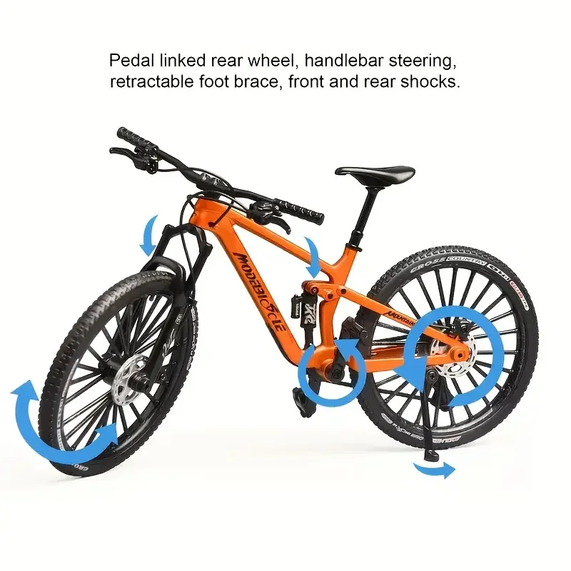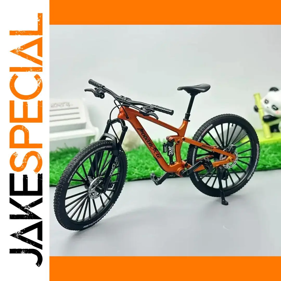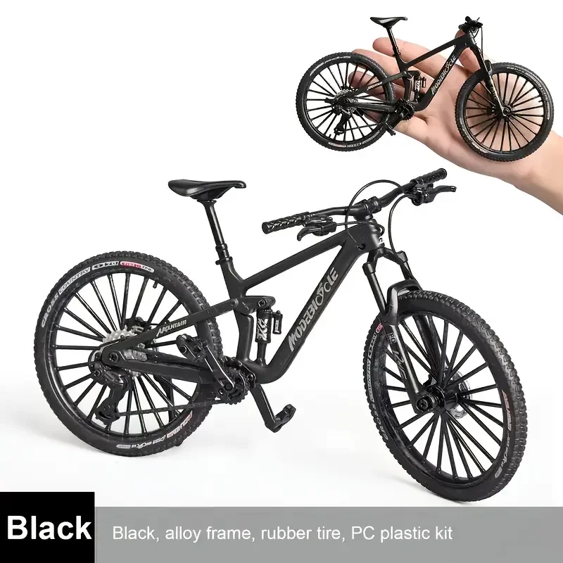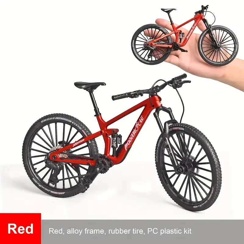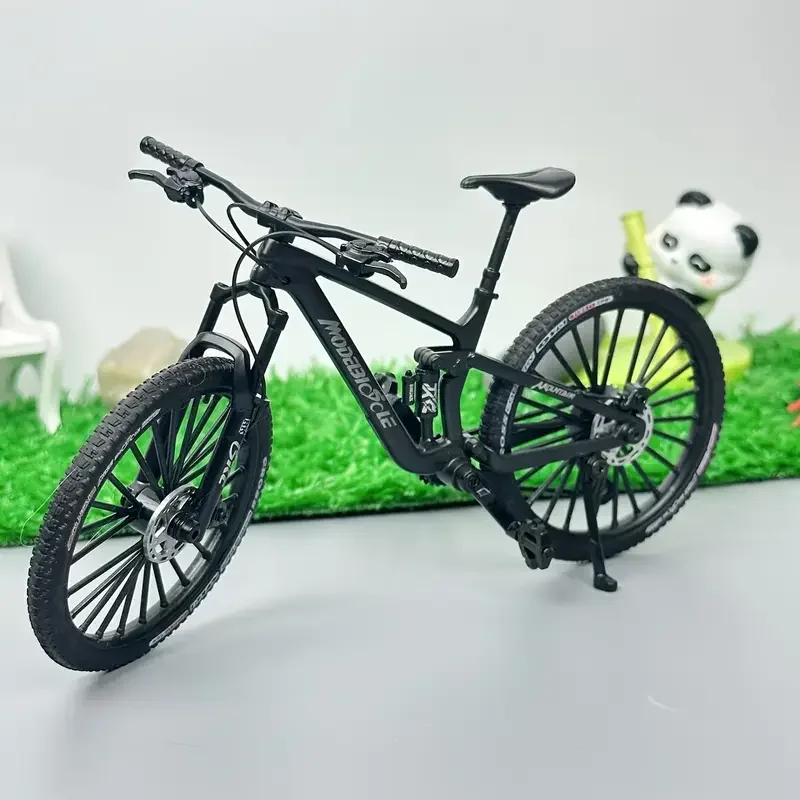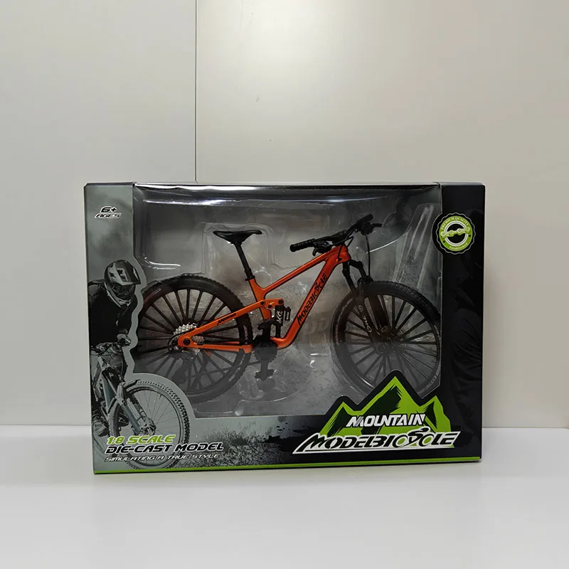 This 1:8 scale mini alloy mountain bicycle model measures 20.5 x 12 x 9 cm and is crafted from durable metal. It features realistic shock absorbers, detailed spoked rims, textured rubber tires, and a sleek black saddle and handlebar, capturing an authentic mountain bike aesthetic. The model is non-electric, designed for collectors aged 14 and above, and showcases precise craftsmanship with a polished metallic finish. Available with or without a box, it makes an ideal display piece for enthusiasts who appreciate lifelike details and realistic design elements that evoke the rugged appeal of a real mountain bike.