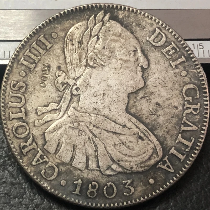 Experience the timeless appeal of this meticulously crafted replica coin reminiscent of early 19th-century European craftsmanship. Featuring a detailed portrait of King Carlos IV, it captures the intricate artistry seen in historical currency, with a silver-colored finish that evokes an antique European style. The coin's textured surface suggests age and authenticity, enhanced by signs of vintage wear. Its obverse displays a regal profile with a laurel wreath crown, delicately engraved facial features, and draped clothing with fine folds. Encircling inscriptions such as “CAROLUS IIII,” “DEI GRATIA,” and the date “1803” are accentuated by a dotted border, adding to its ornate appearance. This casted replica embodies elegance and historical charm, perfect for collectors seeking a realistic vintage aesthetic.