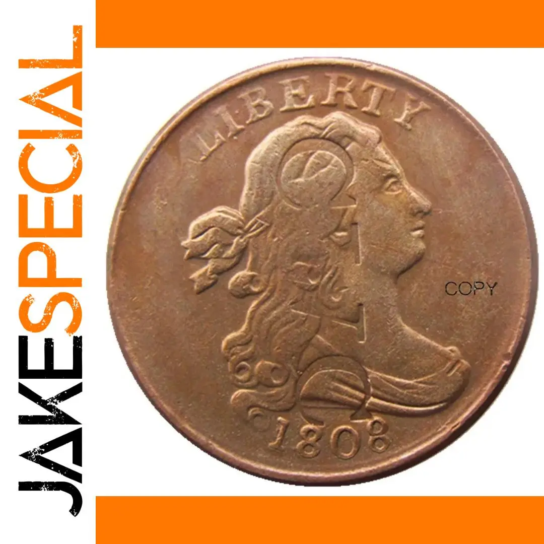 - Authentic reproduction of the 1808 CWC Draped Bust Half Cent, displaying Lady Liberty’s detailed profile with flowing curls and finely engraved features.