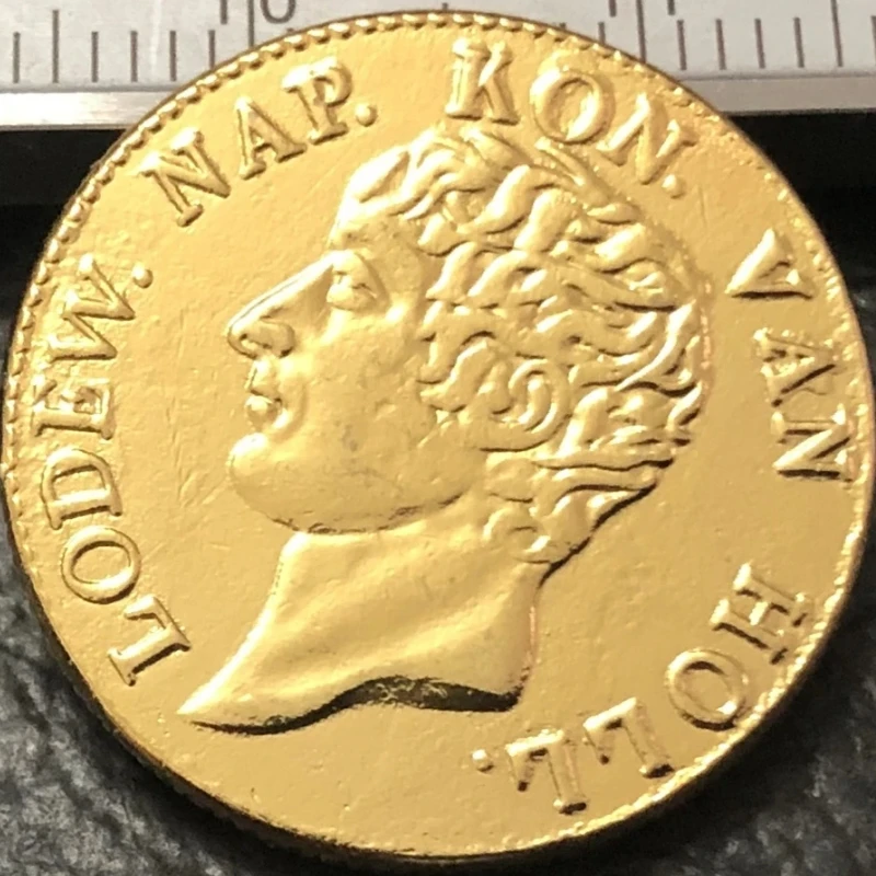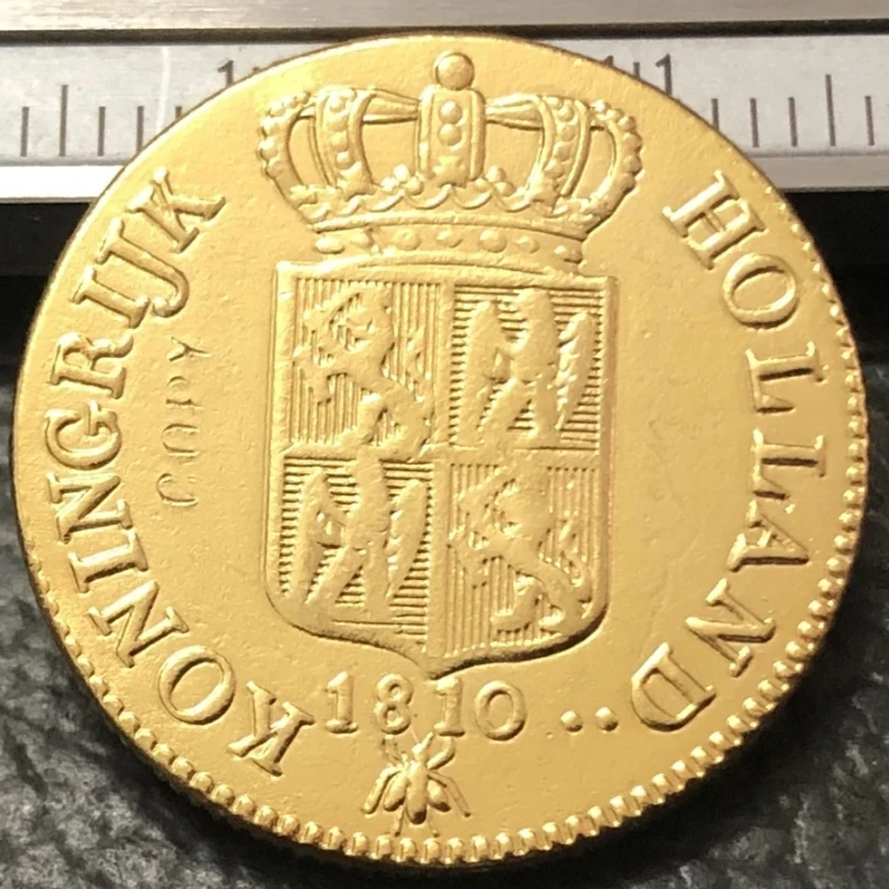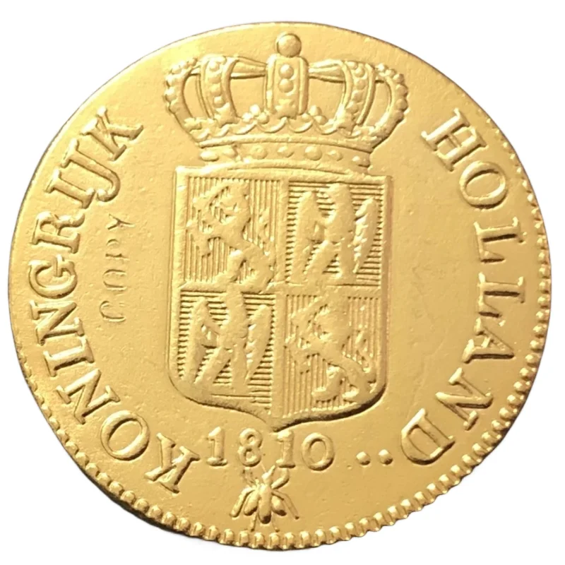 Imagine owning a piece of European history with this stunning replica of the 1810 Netherlands 1 Ducat-Louis Napoleon gold coin. Crafted with intricate detail, this coin showcases a regal crown at the top, richly embossed with multiple arches and decorative elements, symbolizing royalty. Below the crown, a finely detailed shield or coat of arms is divided into four heraldic quadrants, each decorated with traditional heraldic symbols that reflect European heritage. The outer edge of the coin is adorned with a dotted or beaded border, lending it an antique, vintage aesthetic. Its textured matte finish amplifies the aged appearance, making it a perfect addition to any collection of historic coins or decorative artifacts.