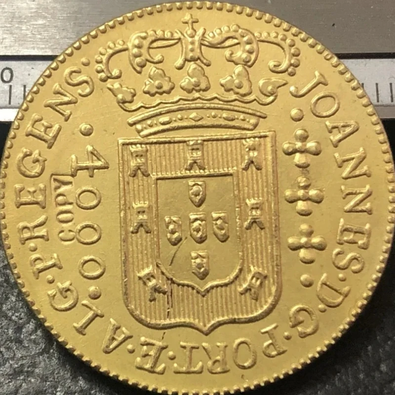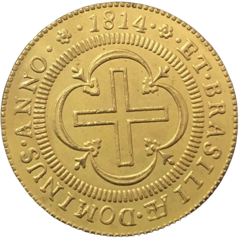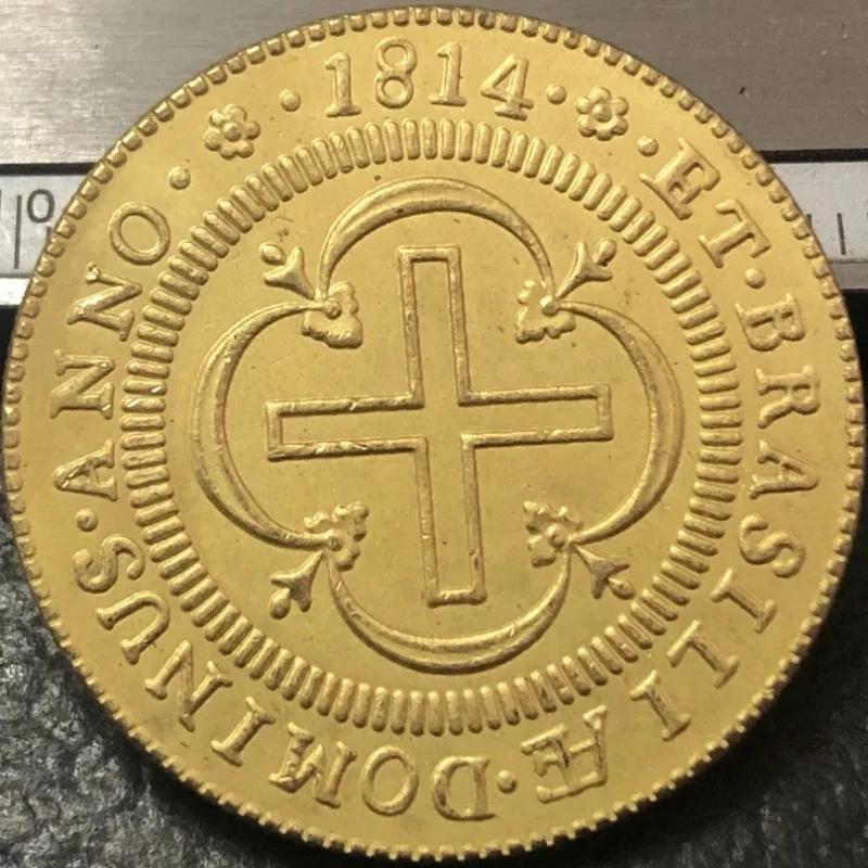 Step into history with this beautifully crafted replica of the 1814 Brazil 4000 Reis coin featuring João, Prince Regent. Made with a rich, gold-toned finish, this coin boasts a polished metallic sheen that closely mimics vintage gold, adding a touch of antique elegance. Its circular shape is enhanced by a detailed, raised edge border, giving it a refined, authentic feel. The central design showcases an ornate cross within intricate symmetrical looping patterns and delicate floral motifs, reflecting the detailed craftsmanship of early 19th-century coinage. Encircling this, the outer rim bears inscribed text in capital letters, separated by decorative dots, creating a classic and patriotic aesthetic. Its sharp embossment and historically inspired design make it a captivating collector’s piece or decorative item.