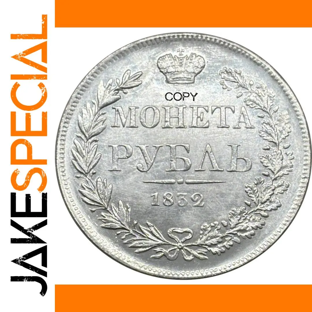 Experience the timeless elegance of the early 19th century with this beautifully crafted replica of the 1832 Russian ruble. Meticulously designed to mirror historic coin standards, this coin features intricate engravings, a radiant metallic finish, and elaborate decorative elements that evoke antique European artistry. The detailed relief work includes a crowned emblem at the top, surrounded by a wreath of laurel and oak branches, encircling the iconic inscription “МОHEТА РУБЛЬ” and the year of minting. Its textured beaded border adds a classical finishing touch, offering a perfect blend of historical accuracy and aesthetic appeal. This collectible piece perfects your collection while emphasizing refined craftsmanship and historic charm.