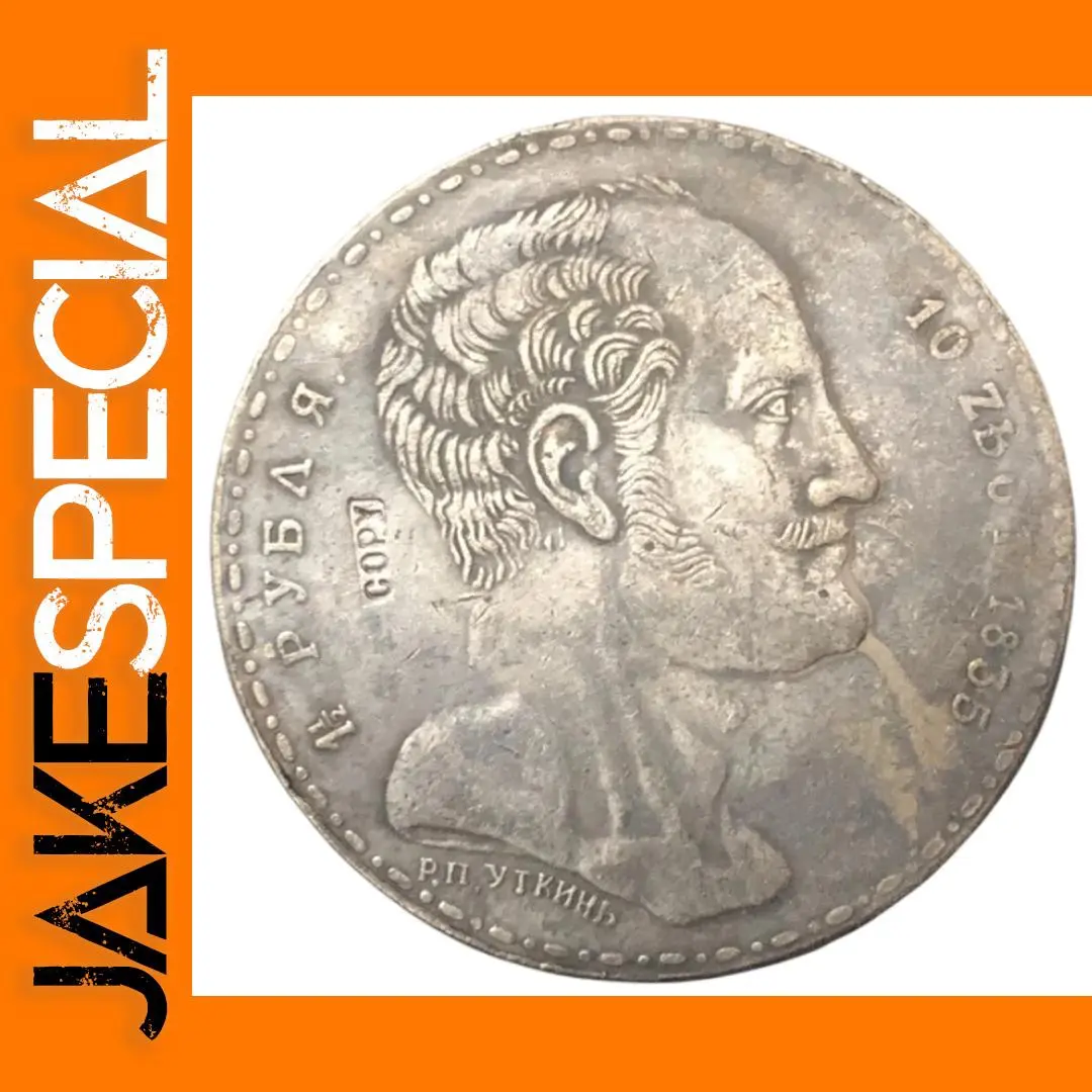 Immerse yourself in history with this meticulously crafted replica of the 1835 Russian 1.5 Rouble. Made from high-quality durable metal, this piece faithfully reproduces the original’s intricate engraving details and textured surface. The detailed profile portrait of a distinguished man features wavy, engraved hair, a prominent mustache, and a well-defined beard, creating a realistic and captivating appearance. Surrounded by Cyrillic inscriptions, including the name “Р. П. УЛИГИНЬ,” and framed with rounded edges and a delicate beaded border, this replica exudes antique charm and artistic craftsmanship. Its size closely matches the original, making it a striking collectible and historical decoration. Whether displayed in your collection or shared as a thoughtful gift, it’s a timeless piece that embodies Russian heritage and artistry.