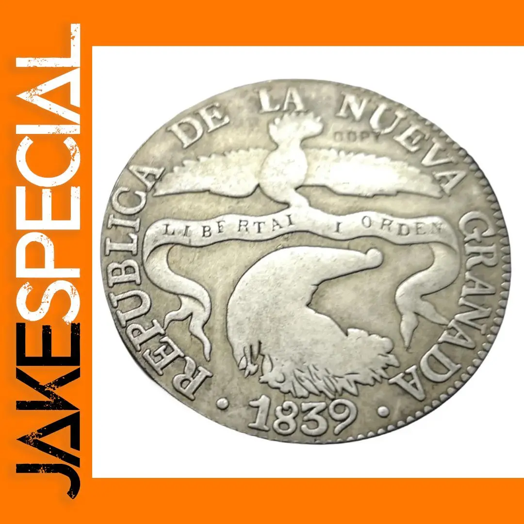 Experience the beauty and historical significance of this remarkable 1839 Colombia 8 Reales reproduction. Crafted with meticulous attention to detail, this piece captures the essence of the original coin, featuring a bold eagle at the center symbolizing freedom and independence. The silvery surface, textured to highlight fine line work and shading, offers an authentic antique look. The beaded, ridged edges add to its vintage appeal and enhance its overall craftsmanship. Whether displayed or added to your collection, this piece serves as a powerful reminder of Colombia's rich history. Its durable construction ensures it remains a cherished artifact for years to come, elevating your appreciation of historical numismatics.