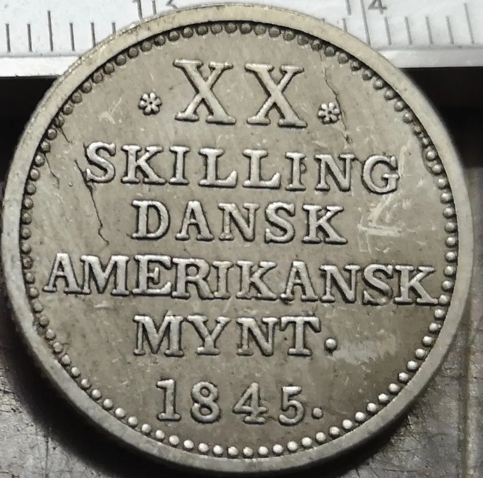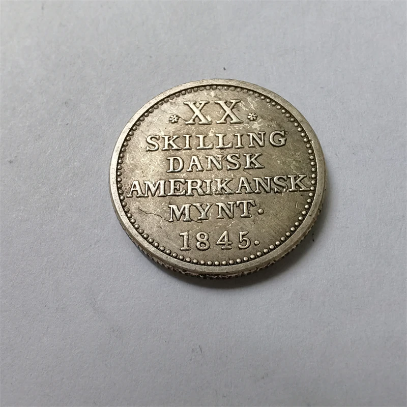 This replica coin faithfully reproduces the 1845 Danish West Indies 20 Skilling-Christian VIII, crafted with a casting technique from durable metal. It features a silver-tone finish with a slightly matte surface that accentuates intricate relief details reminiscent of mid-19th-century currency. One side displays a detailed coat of arms enclosed within a beaded border, while the other bears a bold inscription reading “XX SKILLING DANSK AMERIKANSK MYNT 1845,” separated by decorative dots. Originating from the period 1840-1859 and showcasing vintage, antique US style motifs, this customizable collectible offers an authentic, historical aesthetic for adult collectors and enthusiasts.