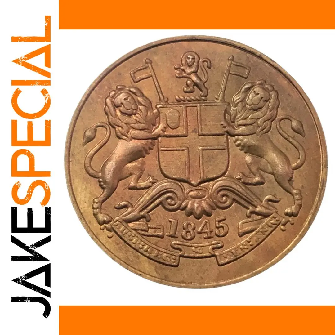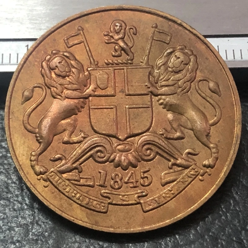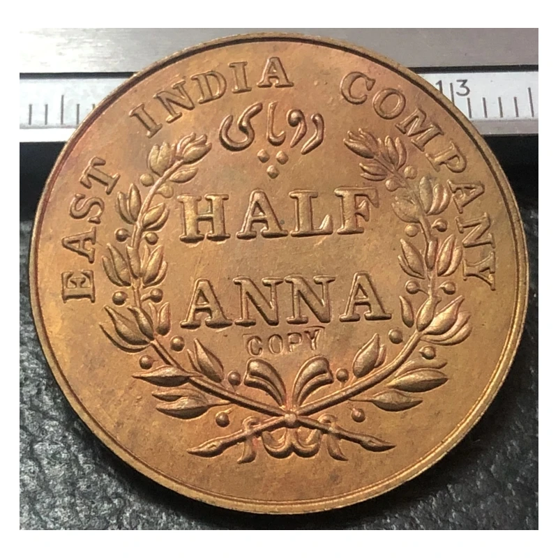 Own a striking replica of a 1845 Indian bronze coin with a 2/1 Anna denomination, featuring an antique patriotic design. Made of metal with a warm bronze tone, this cast imitation showcases intricate details, including a shield divided into four quadrants, a fierce lion rampant holding flags, and two stylized lions flanking the shield, all with finely detailed manes and muscular forms. The coin’s surface has a slightly aged finish, enhancing its vintage charm. Measuring approximately 2-3 centimeters in diameter with a smooth, rounded edge, this collectible piece is perfect for enthusiasts of historical or patriotic memorabilia, offering an authentic visual appeal without being an original coin.