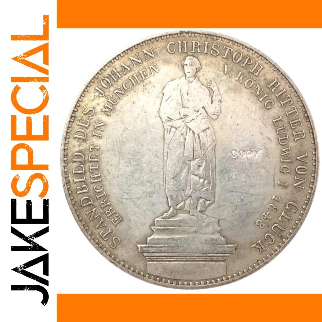 Immerse yourself in historical elegance with this meticulously crafted 1848 Bavaria replica, showcasing a detailed depiction of Johann Christoph von Gluck in a classical pose, dressed in flowing robes and standing on a tiered pedestal. Made from high-quality durable metal, its polished, shiny silver finish highlights a vintage, antique style. The intricate line work and fine craftsmanship emphasize its regal aesthetic, while a decorative beaded border adds an extra touch of sophistication. Perfect for collectors or as an impressive decorative piece, this replica captures the grandeur of Bavaria’s artistic heritage and invites you to visualize it as part of your space, enriching any collection or display with timeless charm.