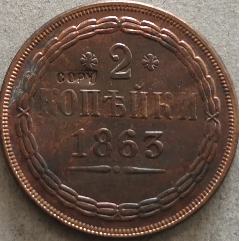 Imagine adding a touch of vintage history to your collection with this stunning copper replica coin. Crafted with intricate detail, it authentically reflects the antique style of the 1860s, showcasing a textured, aged metal look. Its design features a raised border of beads, a chain-like pattern encircling the central motifs, and detailed inscriptions including “2”, “COPY”, and “2 КОПЪЙКИ” with the year “1863.” The textured surface, tonal variations, and matte finish give it a genuine vintage feel. Perfect for display or as a collector’s item, this coin echoes the grandeur of the Russian Empire era and offers a meaningful glimpse into history.