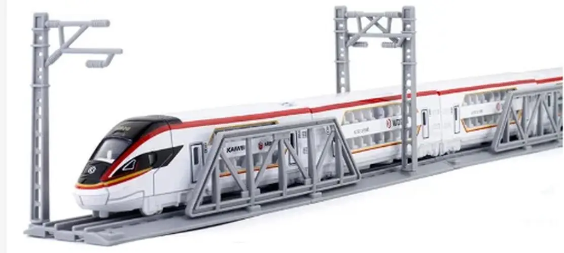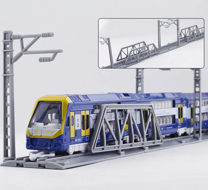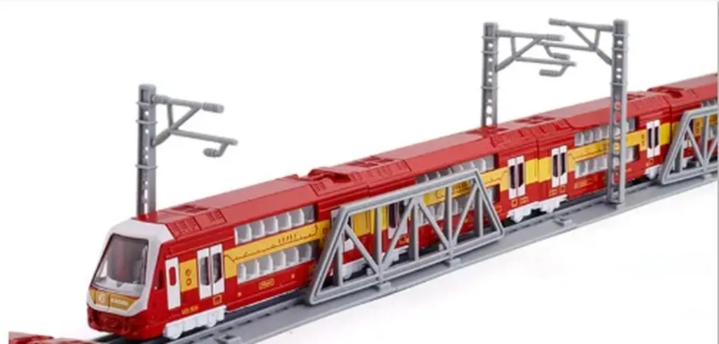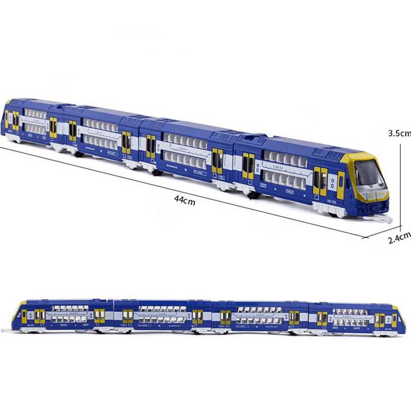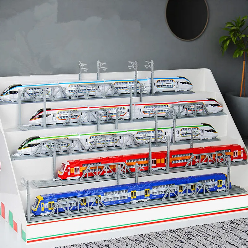 The 1:87 scale diecast double-section train and tram model showcases vibrant colors of white, blue, and red. With dimensions of 40cm x 2.4cm x 3.5cm, it features a high-speed train on top, embellished with yellow accents and detailed windows. The lower section consists of two connected trains, designed for a realistic layout display. Crafted from durable metal (zinc alloy), plastic, and rubber, this non-electric model operates with a pull-back mechanism, making it both engaging and visually appealing for collectors. Experience the intricate craftsmanship and attention to detail in this striking train model, perfect for display or imaginative play.