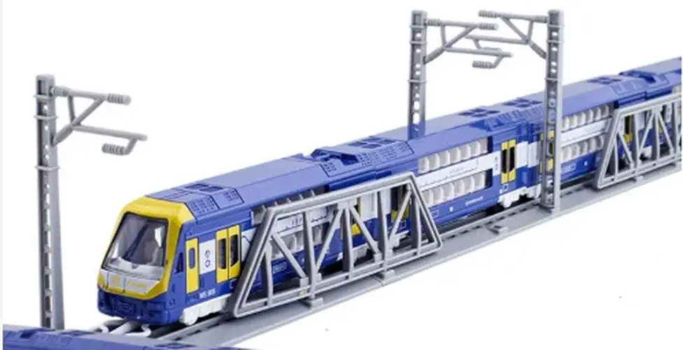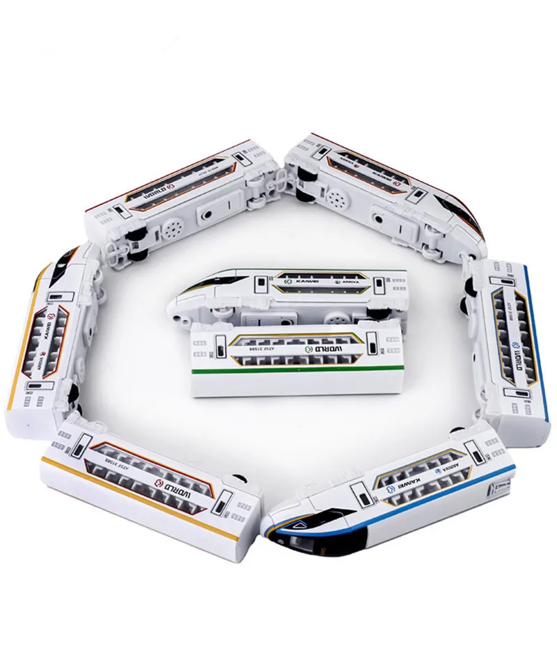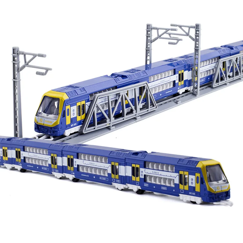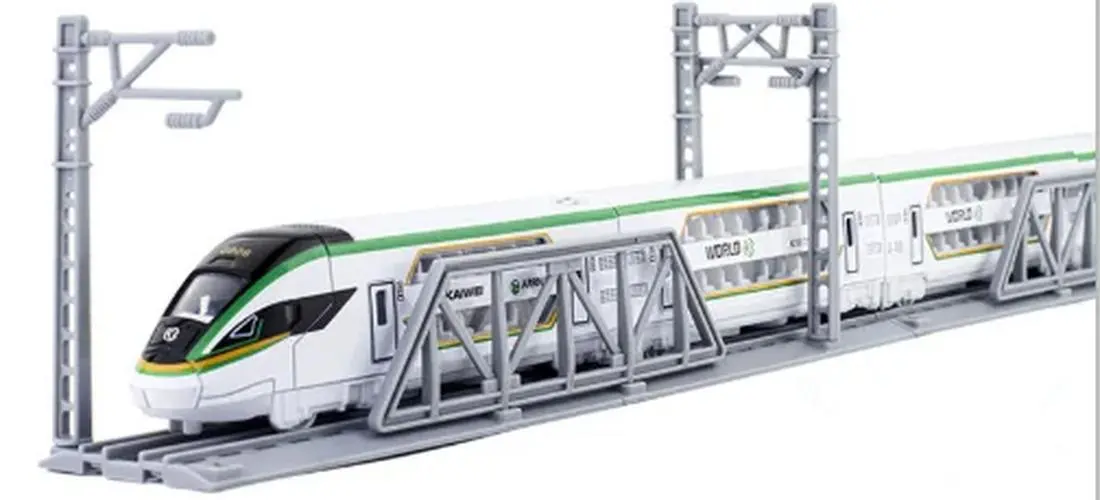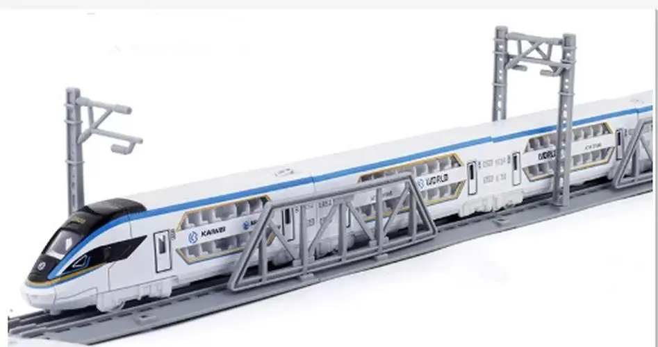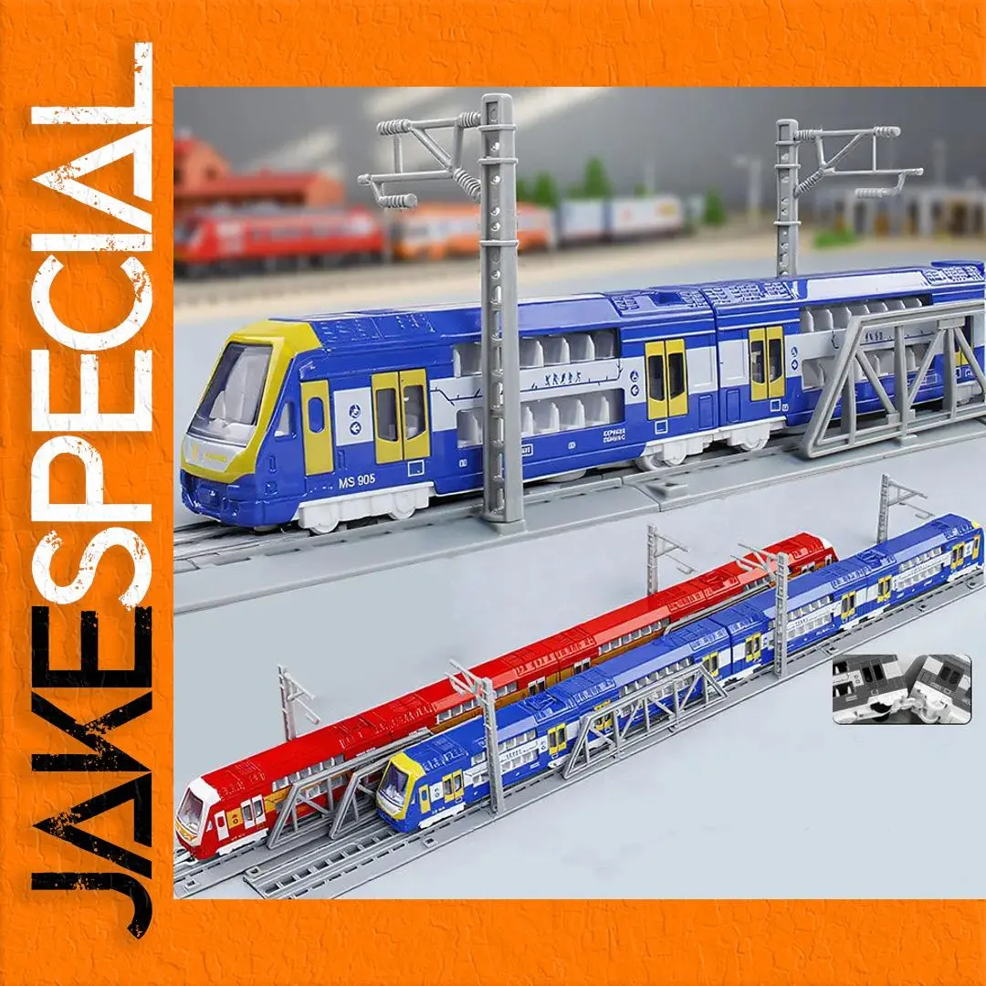 The 1:87 scale diecast double-section train and tram model showcases vibrant colors of white, blue, and red. With dimensions of 40cm x 2.4cm x 3.5cm, it features a high-speed train on top, embellished with yellow accents and detailed windows. The lower section consists of two connected trains, designed for a realistic layout display. Crafted from durable metal (zinc alloy), plastic, and rubber, this non-electric model operates with a pull-back mechanism, making it both engaging and visually appealing for collectors. Experience the intricate craftsmanship and attention to detail in this striking train model, perfect for display or imaginative play.