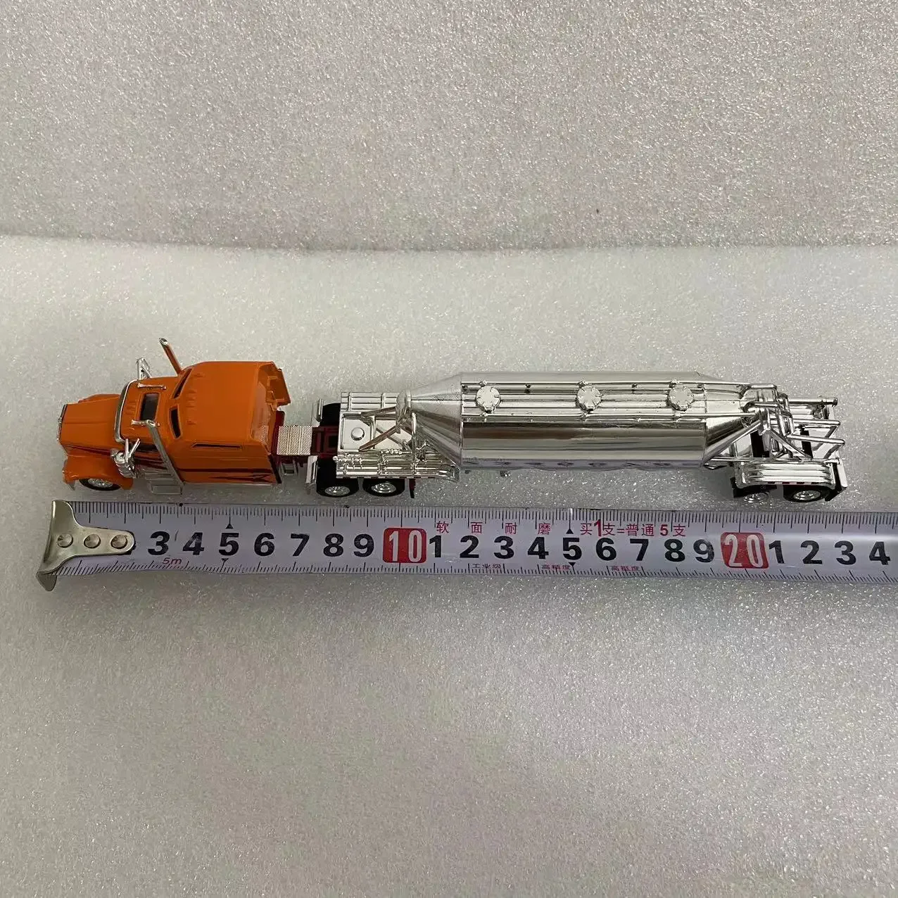 Experience the vibrant presence of this meticulously crafted miniature of the iconic Kenworth W900 truck. Measuring about 24 centimeters in length, this diecast collectible captures the bold design and rugged appeal of this classic heavy-duty vehicle. The cab is painted in a bright, glossy orange, attracting attention with its vivid color and realistic details such as a textured front grille with a grid pattern and shiny chrome accents. The alloy front and black-painted windows enhance its authenticity, while the metallic silver wheels with detailed tread add a finishing touch of realism. The elongated plastic tank body, matching the cab’s orange hue and slightly imperfect surface, complements the highly reflective, polished silver trailer. This model is perfect for display, collection, or as a gift for enthusiasts.