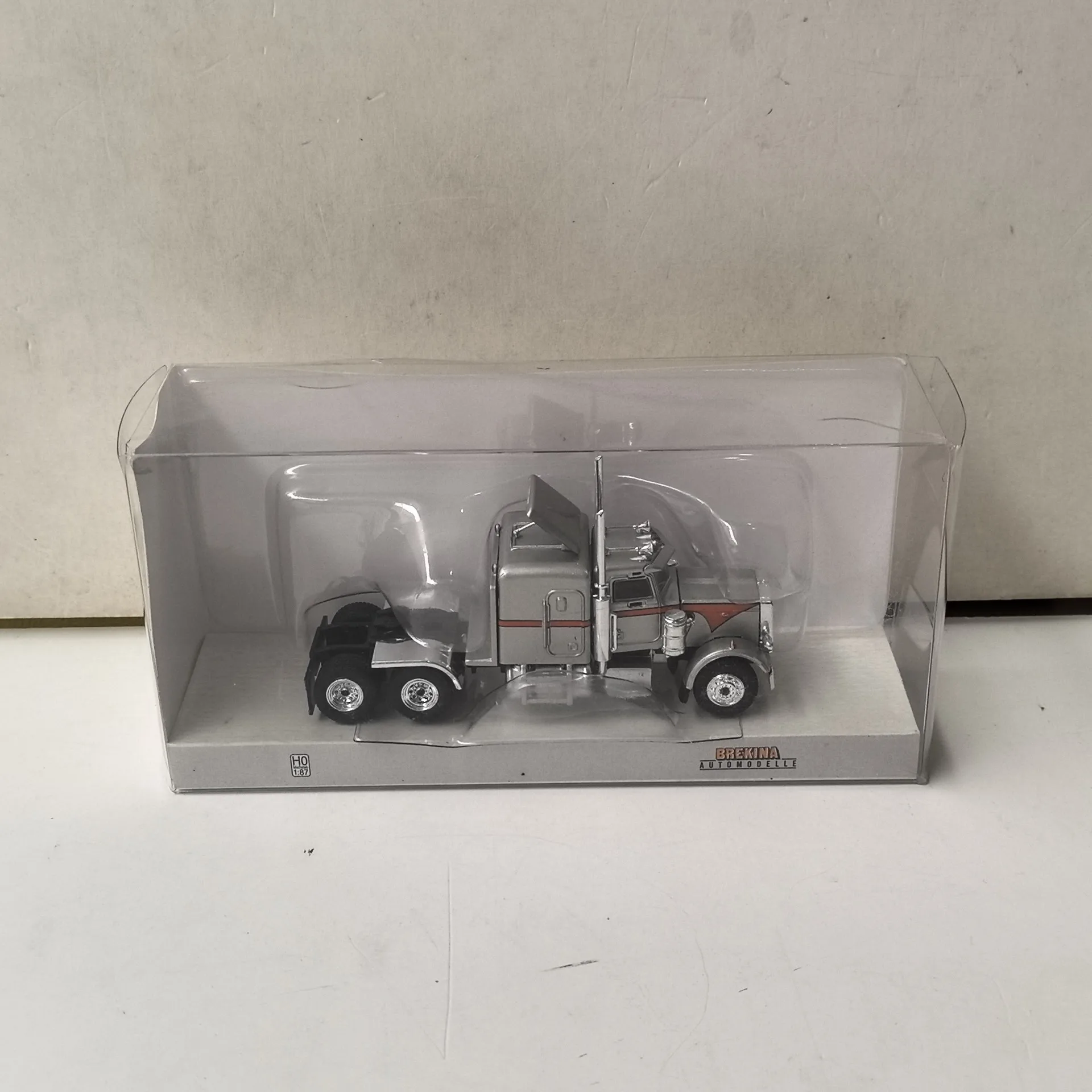 Imagine having this highly detailed 1:87 scale Peterbilt 359 truck model, perfect for your collection or as a gift for a truck enthusiast. Crafted from durable plastic, this model boasts a vintage design featuring a shiny silver finish, realistic details like side mirrors, exhaust pipes, and detailed wheel rims. The elongated hood, classic cab style, and additional roof elements capture the true essence of the iconic Peterbilt 359. Its compact size makes it ideal for display on shelves, desks, or as part of a miniature collection. Whether you're a collector or gifting someone special, this model adds authenticity and style to any space, creating a conversation starter and collection centerpiece.
