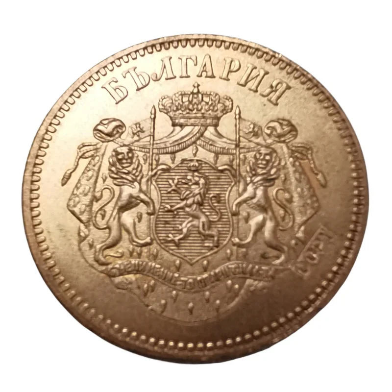 - This imitation copper coin depicts Bulgaria’s national coat of arms and features detailed engravings, highlighting the craftsmanship and patriotism of the late 19th century Bulgaria. An antique-style collector’s item.