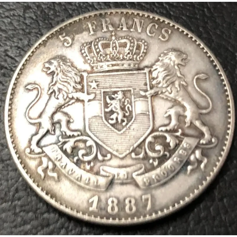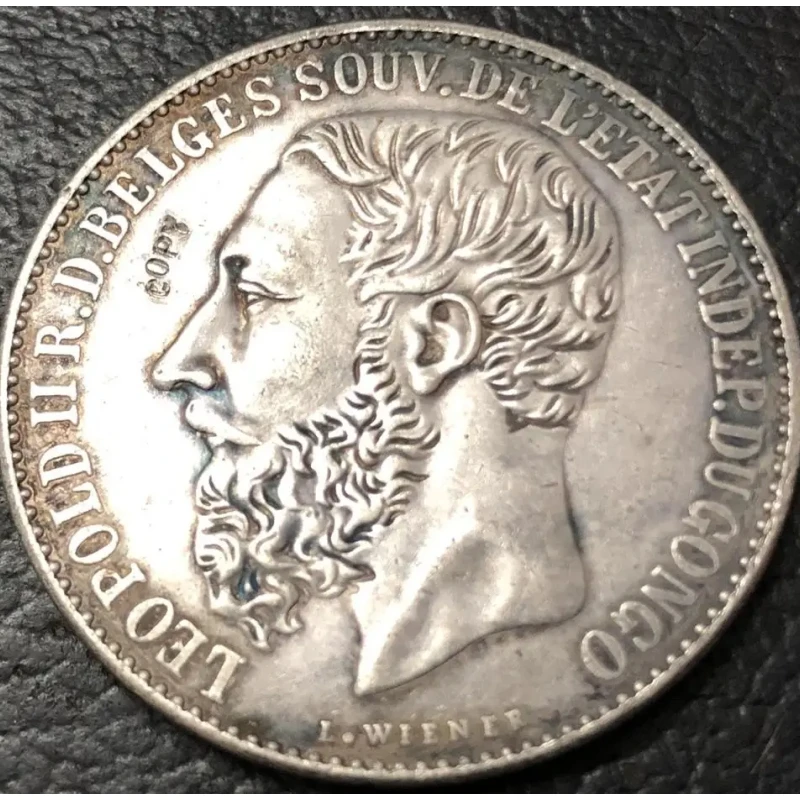 - This coin is a metal reproduction of the 1887 Congo Free State 5 Francs coin, capturing the original's intricate design with precision embossing and aged patina for authentic appearance.