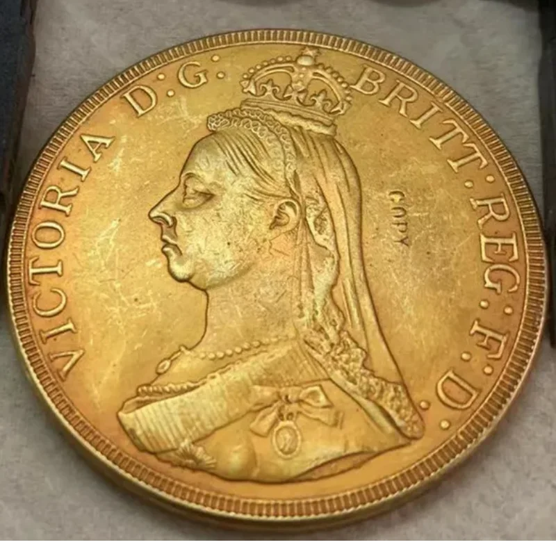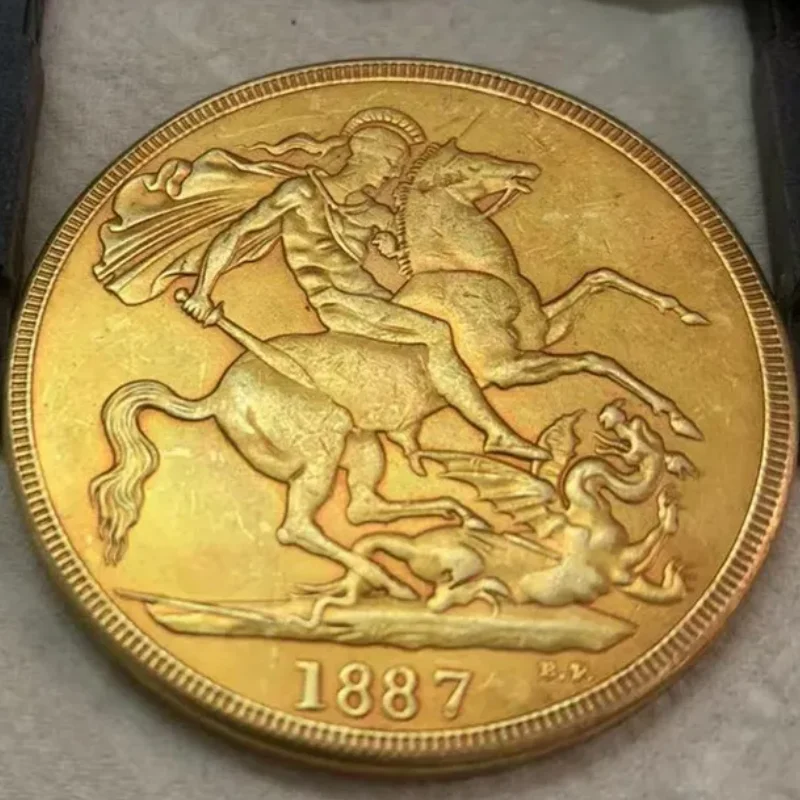This intricately crafted imitation coin replicates the 1887 United Kingdom Crown-Victoria, made from metal with a polished gold finish. Featuring a vintage European style, it displays a detailed relief of a regal figure on horseback, wearing a crown and cloak, with the dynamic motion captured by a muscular horse with a flowing mane. The bold “1887” inscription is prominently engraved below, surrounded by a textured, ridged rim that adds to its ornate, antique aesthetic. Crafted with meticulous techniques, this replica offers a rich, historical appearance, perfect for collectors and enthusiasts who appreciate classical craftsmanship and elegant design.