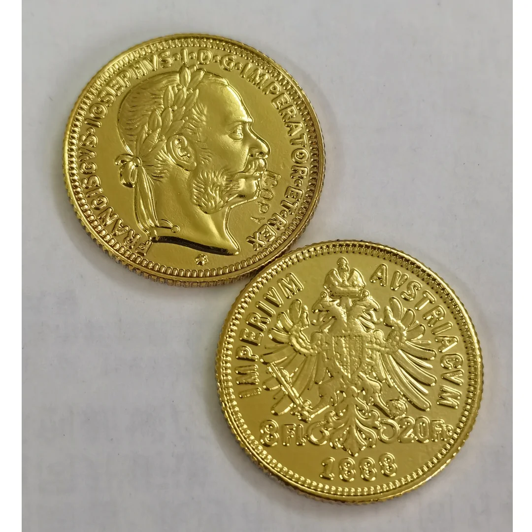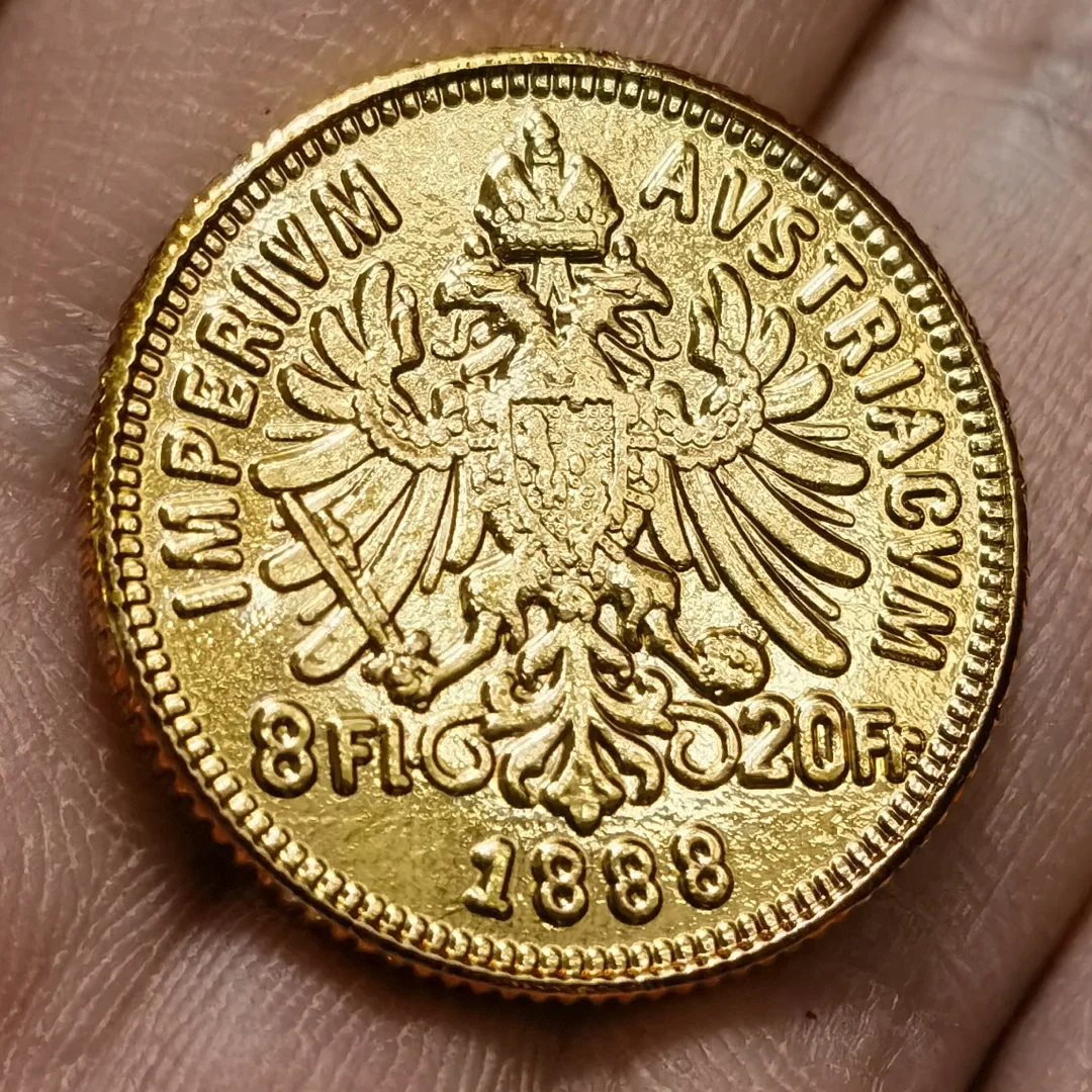 Imagine owning a beautifully detailed replica of the 1888 Austrian 8 Florins coin, capturing the grandeur of late 19th-century European currency. Crafted from durable copper alloy, this coin features a polished antique gold-tone finish that gives it an authentic aged appearance. The surface is smooth yet intricately textured, highlighting the finely engraved profile of Emperor Franz Joseph I, including his wavy hairstyle, prominent mustache, and beard. Encircling the portrait are Latin inscriptions that add to its historical authenticity. The reeded edge, with its fine vertical grooves, enhances the realistic feel. Perfect for display, educational purposes, or passionate collections, this piece lets you connect with European history in a tangible way.