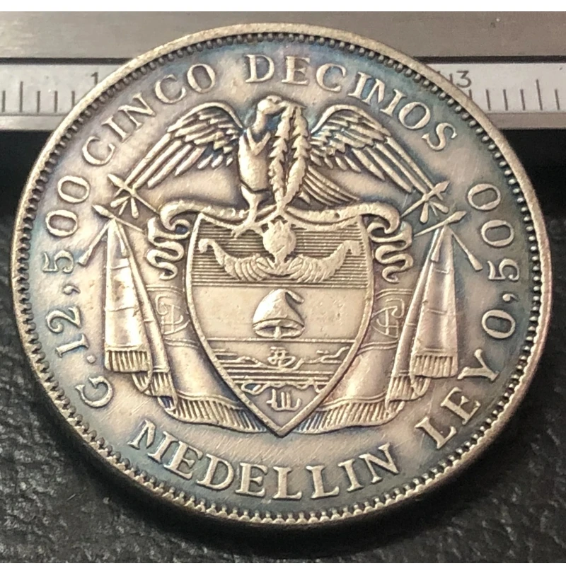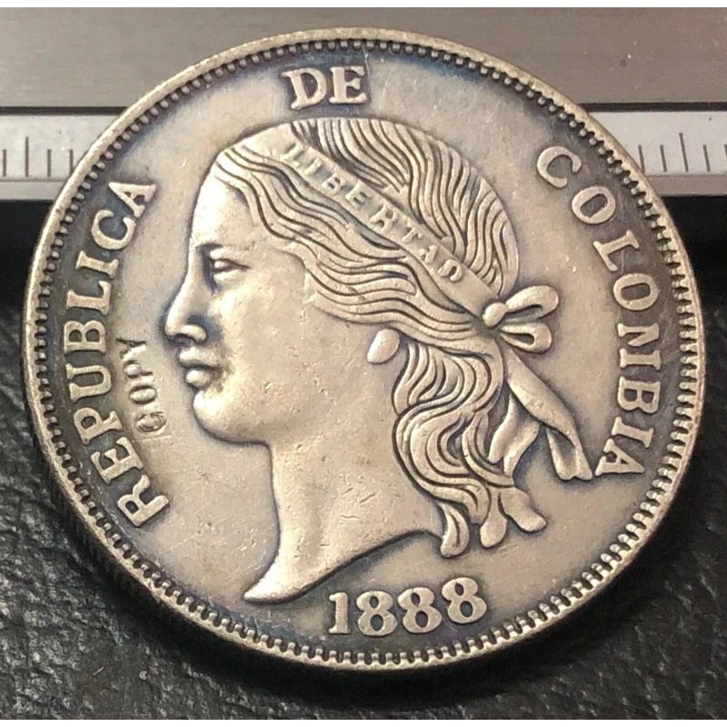Own a striking replica of the 1888 Colombian Old Peso 5 Decimos coin, meticulously crafted through casting techniques to showcase authentic antique design. Made of metal with a polished silver finish, this collectible features a detailed profile of a woman with flowing hair, a headband tied at the back, and ornamental ribbon ends, all surrounded by inscriptions in a vintage-style font. The coin’s textured background contrasts beautifully with the polished raised elements, giving it a classic, historic aesthetic reminiscent of the late 19th century. Perfect for display or collection, this European-style imitation is designed to showcase craftsmanship and historical charm.