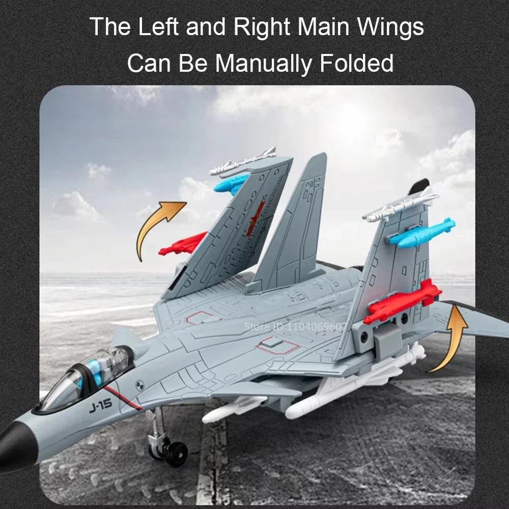 Experience the thrill of aviation realism with this detailed 1:89 scale J-15 fighter model toy. Constructed from durable metal and ABS, this model measures approximately 25 x 20 x 8.5 cm, perfectly capturing the sleek aerodynamic shape of the original aircraft. It features intricate panel lines, decals, and a pointed black nose cone that enhances its authentic military appearance. The transparent cockpit canopy adds a refined touch, while the foldable wings, decorated with black tips and decals, mimic real operational features. Perfectly suited for display and collection, this model combines high craftsmanship with playful functionalities such as lights, sound effects, pull-back motion, and foldable wings. It’s an impressive replica that will elevate any model aircraft collection.