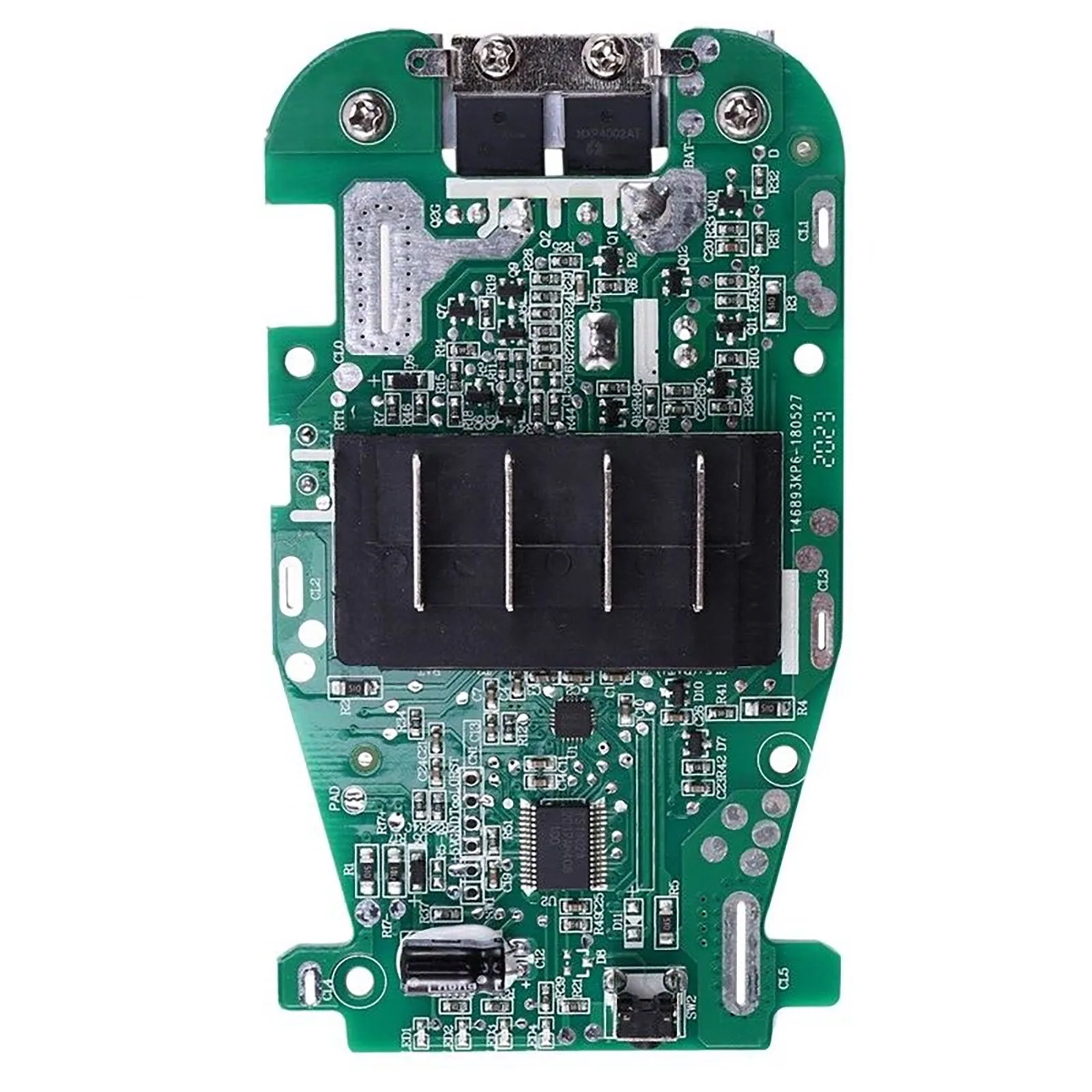 This replacement 18V lithium-ion battery charging protection PCB circuit board is essential for the repair and assembly of battery packs for various devices. With its vibrant green fiberglass construction, this board not only stands out aesthetically but also houses multiple small electronic components for efficient battery management. Key elements include a prominent black battery connector, several integrated circuits, and clear markings that guide connections. Imagine confidently restoring or building your battery packs, knowing you have the reliability of this expertly designed PCB at your fingertips.