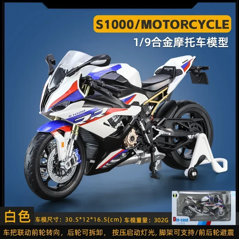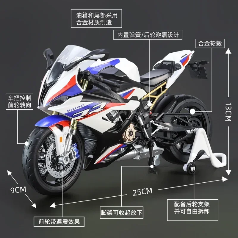 This meticulously crafted 1:9 scale model of the BMW S1000RR motorcycle captures the essence of the original with its striking white exterior and bold blue, red, and black accents. Made from high-quality diecast alloy and plastic, this model showcases detailed features such as realistic wheels with intricately designed spokes, functional suspension with visible shock absorbers, and a sleek aerodynamic shape. The model's dimensions of 23 cm in length, 9 cm in width, and 12.5 cm in height make it perfect for display on your shelf or in your collection. Feel the thrill of owning a piece of motorcycle heritage that speaks to your passion for design and engineering excellence.
