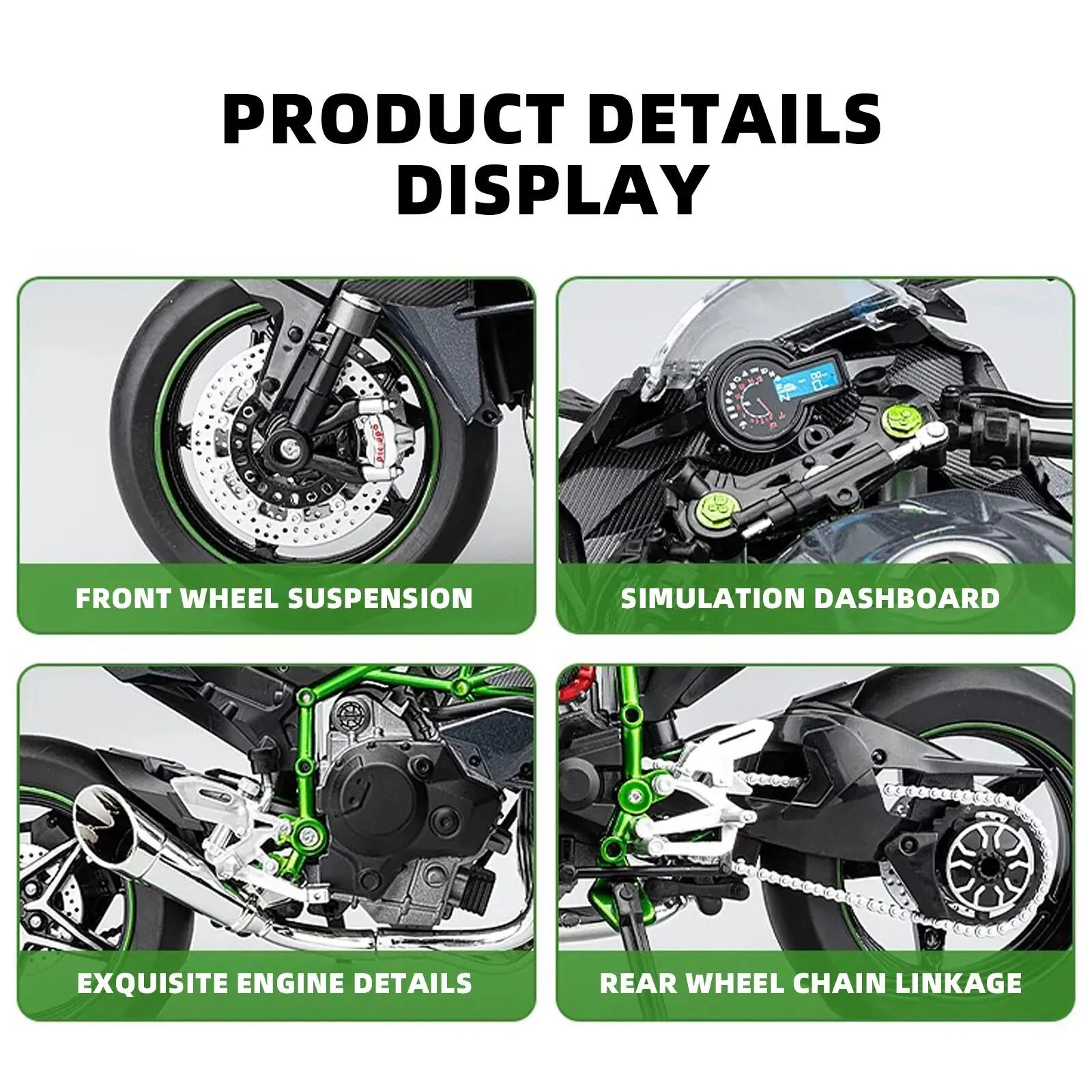 - The detailed design includes a metallic gray and black color palette, with vibrant green accents on rims and frame, enhancing its dynamic, sporty look that captures the spirit of the original Ninja H2R.