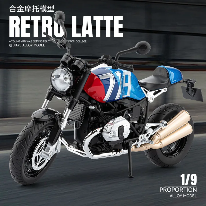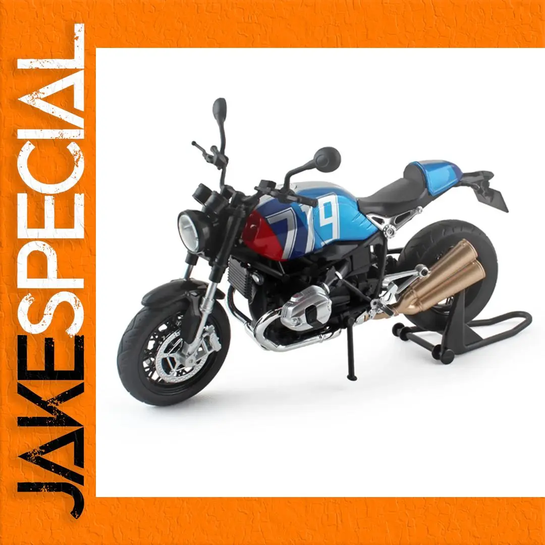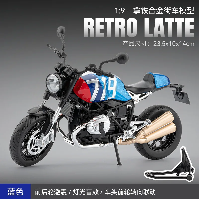 The large 1:9 scale alloy motorcycle simulation model features vibrant blue with red and white accents and the number “79” on the fuel tank. Measuring 23.5 x 10 x 14 cm (9.3 x 3.9 x 5.5″), it boasts a diecast alloy shell for durability, ABS plastic interior detailing, and rubber simulation tires for an authentic experience. The glossy metal painting finish enhances color richness. This non-electric model includes electronic lights and sounds powered by a button battery, with additional manual openings for an immersive experience. Weighing approximately 0.85 kg, it’s a striking showcase of craftsmanship and detail, ideal for collectors.
