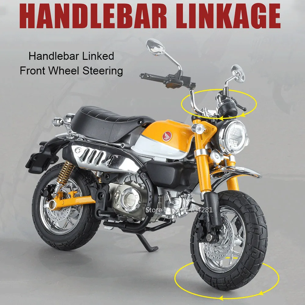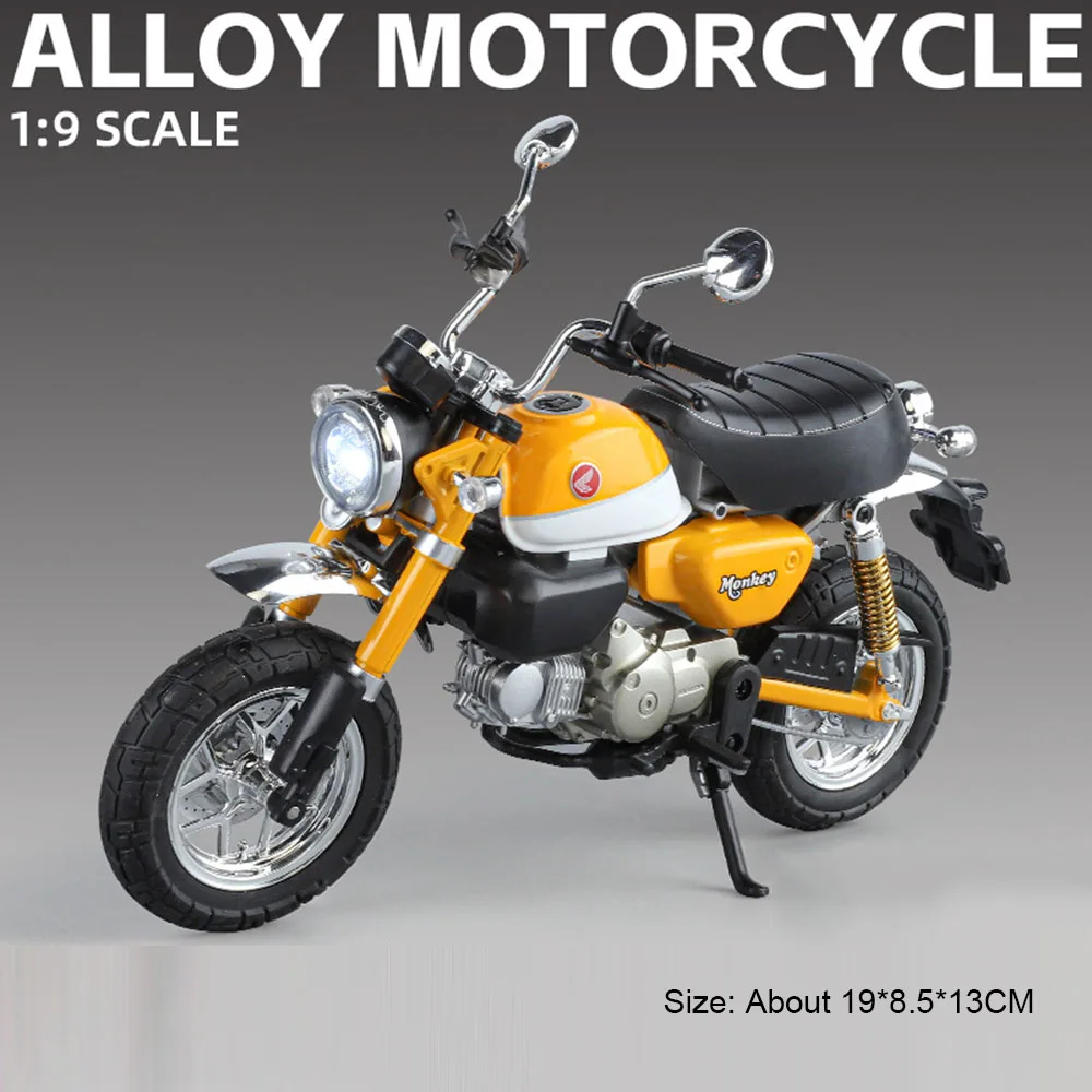 Experience the thrill of owning this meticulously crafted 1:9 scale diecast motorcycle model, designed for display or as a collector’s item. Crafted with a high-quality metal body, shiny chrome accents, and realistic rubber tires, it captures the essence of real motorcycles with impressive precision. The model showcases an eye-catching color scheme, available in Monkey Red, Monkey Blue, CBR1000 Red, Monkey Yellow, and CBR1000 Black. It features functional front wheel handlebar linkage steering, integrated lights, and sound effects, adding an interactive touch. Its robust construction ensures durability and a premium feel, making it perfect for enthusiasts who want to showcase their passion for motorcycles with an authentic and detailed miniature.
