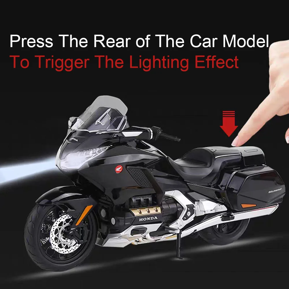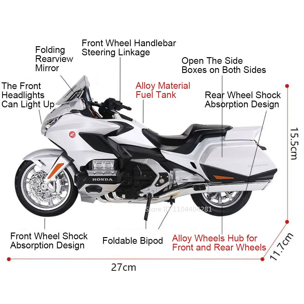 Immerse yourself in the craftsmanship of this highly detailed 1:9 scale Honda CL1800 V4S motorcycle model. Crafted from durable diecast metal with a sleek black finish, this model exudes modern elegance and authenticity. Its intricate features include a transparent curved windshield, realistic headlight, textured rubber tires with detailed disc brake rotors, alloy suspension fork accents, and sculpted, textured fairings that mimic real motorcycle design. The model’s functional front wheel steering enhances realism, while the integrated light and shock absorption capabilities make it both a captivating display piece and a functional toy. Perfect for collectors, enthusiasts, or as a striking gift, this model offers an immersive experience that brings the iconic bike to life in miniature form.