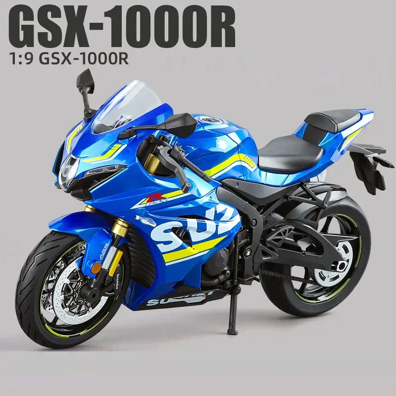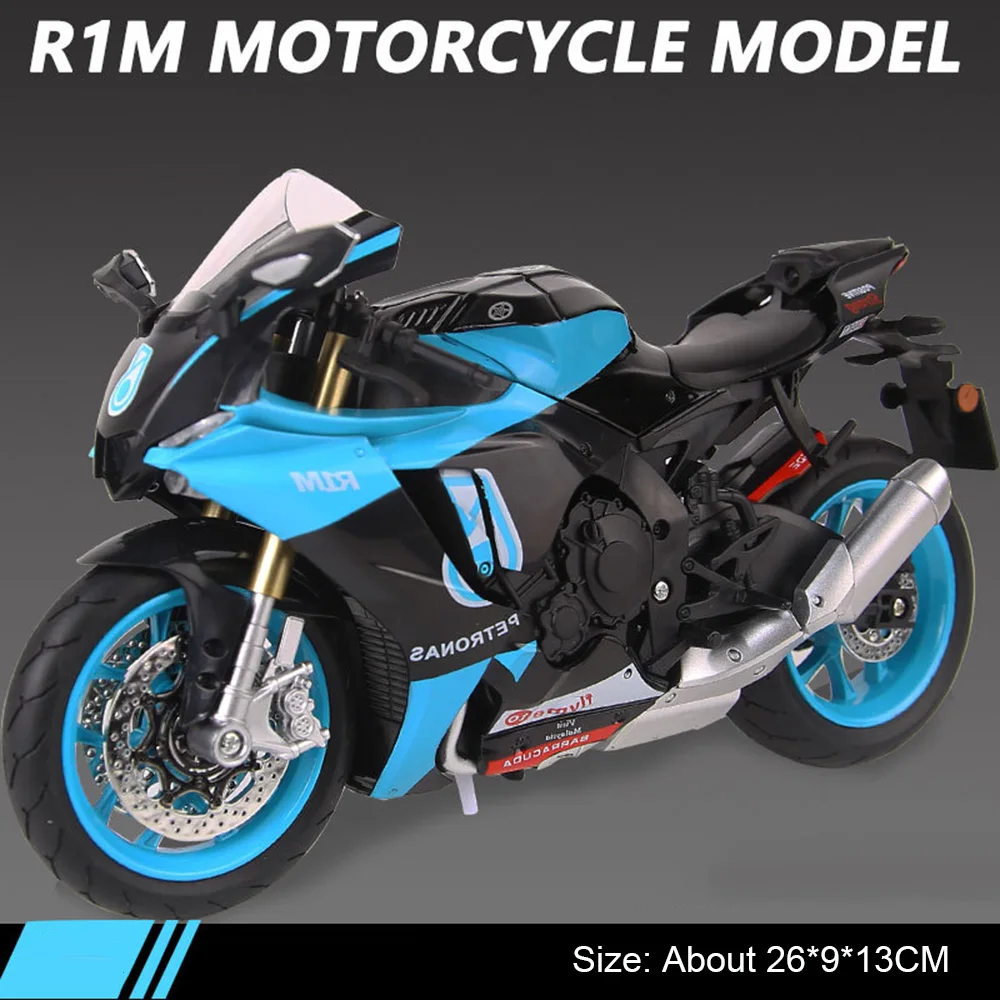 Experience the thrill of high-speed racing with this detailed 1:9 scale motorcycle model, featuring a durable alloy metal body, plastic chassis, and rubber tires. Available in striking colors: R1M Blue, Suzuki Blue, and Suzuki White, this collectible showcases realistic design elements such as LED lighting, front wheel steering, and shock absorption for an authentic feel. Measuring approximately 26 x 9 x 13.5 cm for the R1M version and 22 x 8.5 x 12.5 cm for the Suzuki version, it is crafted for adult collectors aged 14 and above. Precision-engineered to combine mechanical realism with sporty aesthetics, making it a perfect display piece or gift for motorcycle enthusiasts.